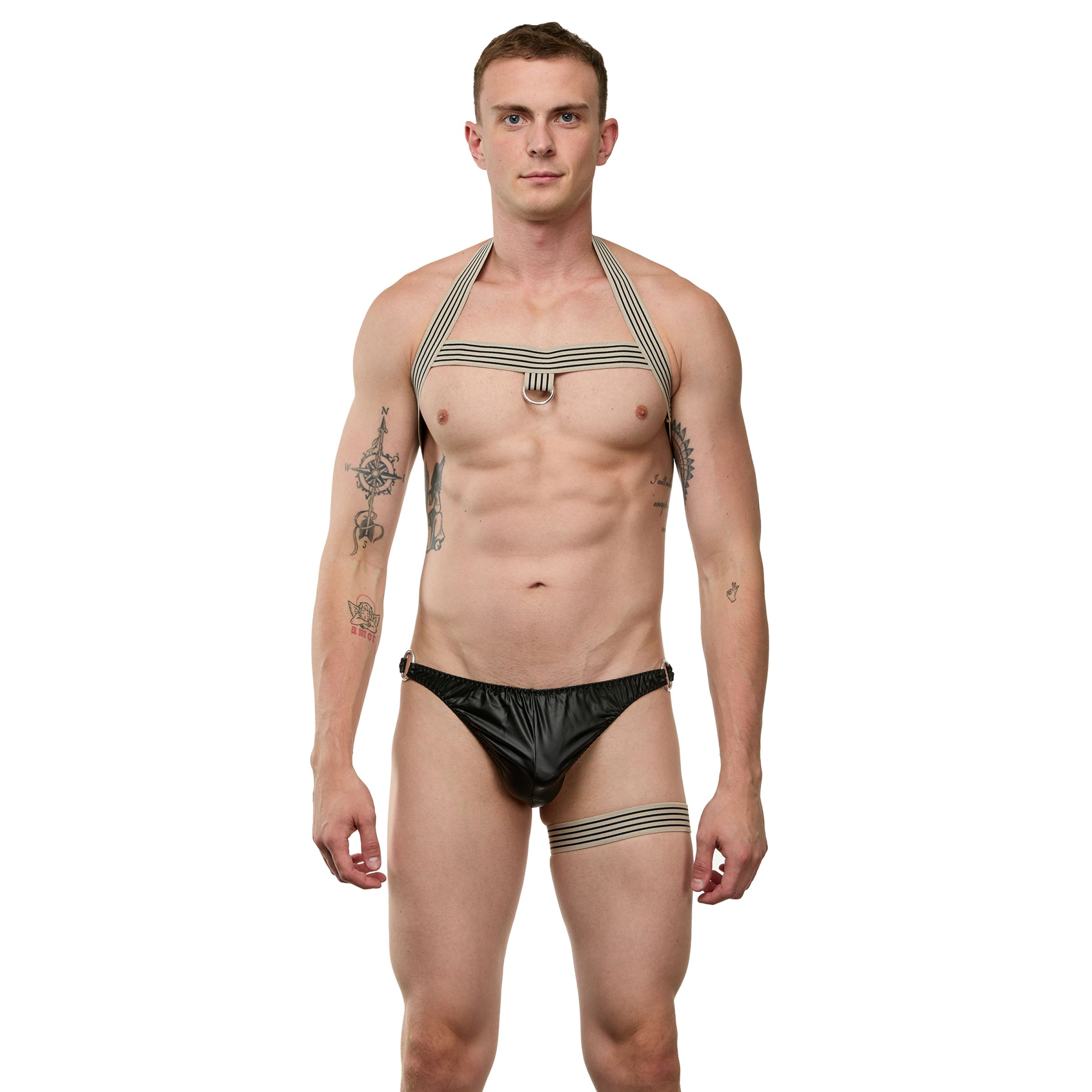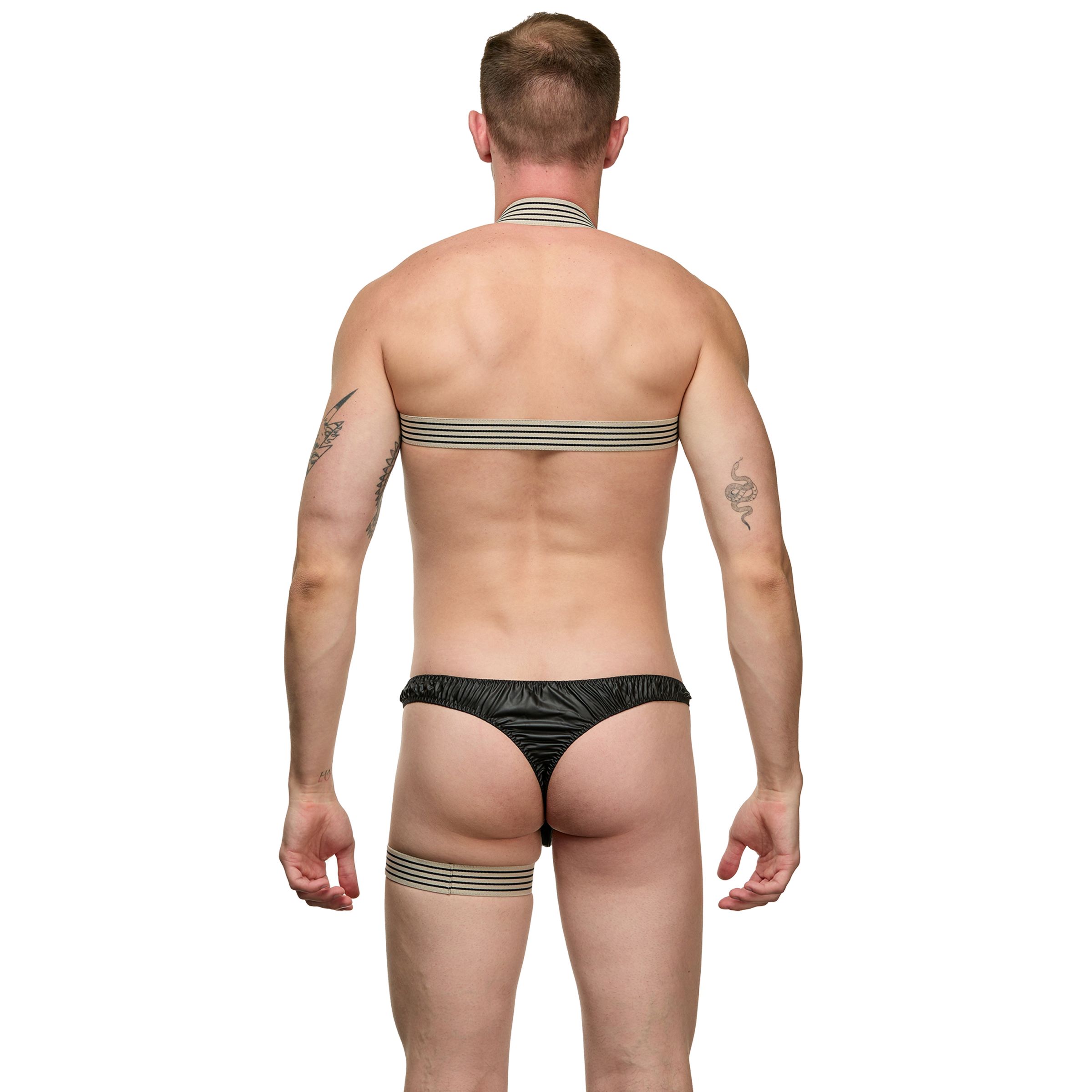 Мужской костюм «Танцор». Выполнен в черно-бежевом цвете и состоит из 3 предметов. В комплекте: трусы-тонги, подвязка на ногу, портупея. Мужской черно-бежевый костюм «Танцор»