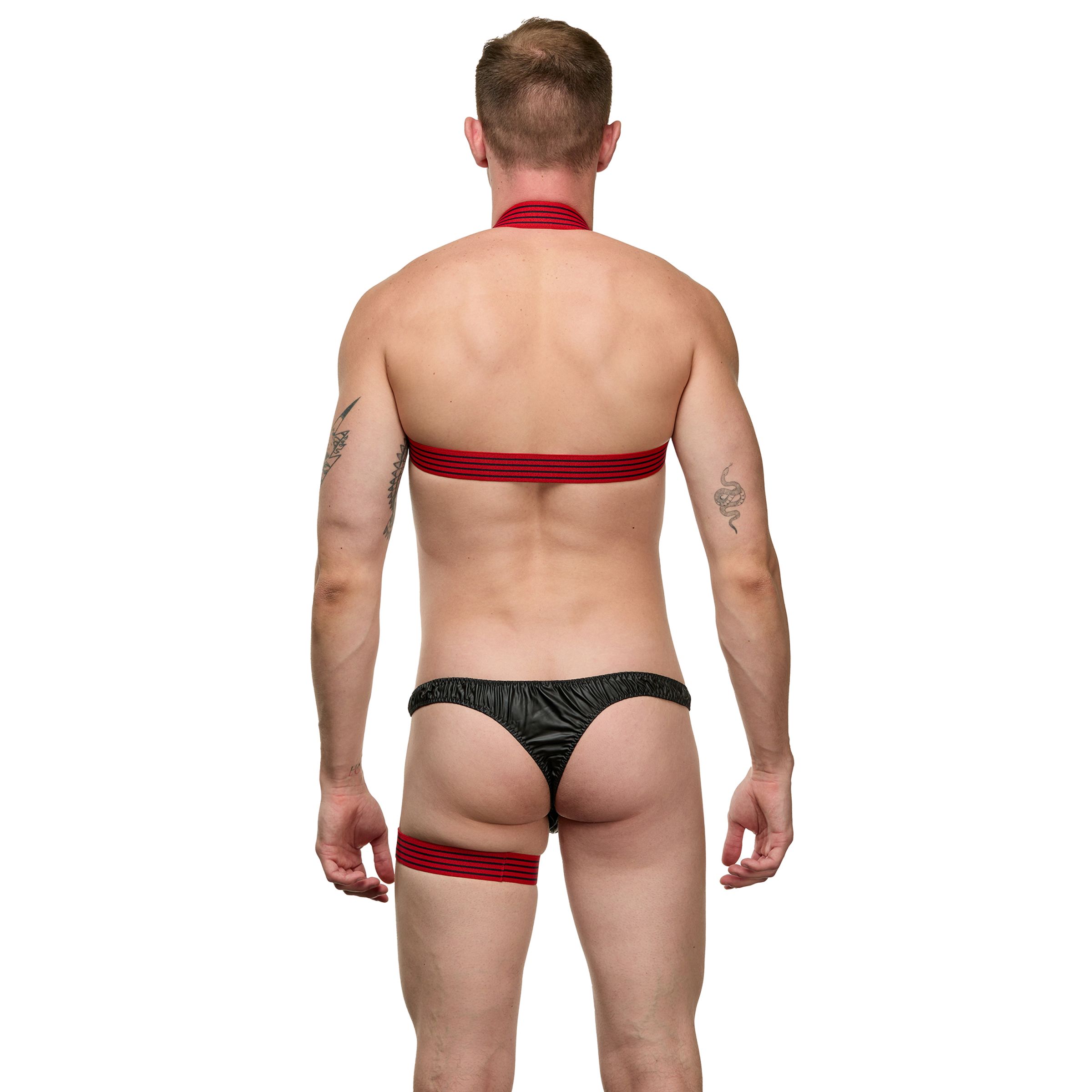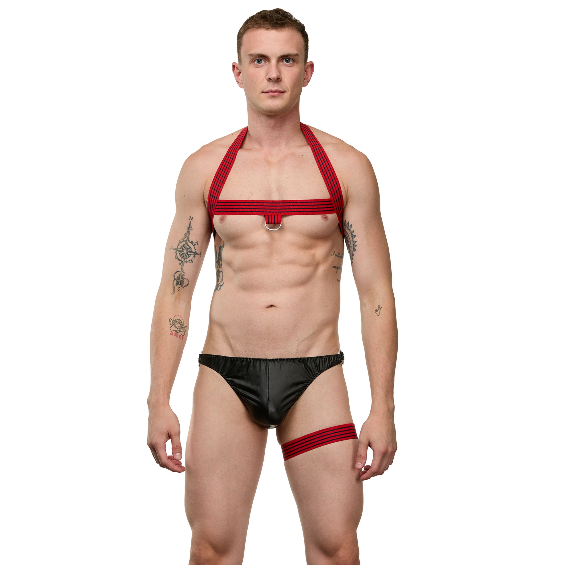 Мужской костюм «Танцор». Выполнен в черно-красном цвете и состоит из 3 предметов. В комплекте: трусы-тонги, подвязка на ногу, портупея. Мужской черно-красный костюм «Танцор»