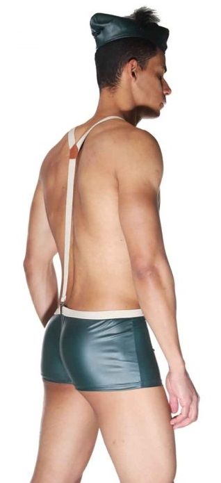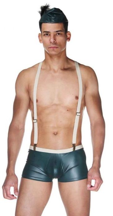 Костюм для мужчин, состоящий из трех предметов: трусов-боксеров, подтяжек и шапочки с перьями. Костюм из плотной гладкой ткани. Шапочка небольшая, также из плотной гладкой ткани, украшена перьями. В комплекте: трусы, подтяжки, шапочка. Мужской игровой костюм «Робин Гуд»