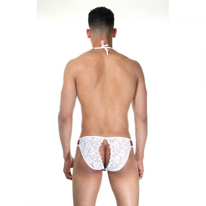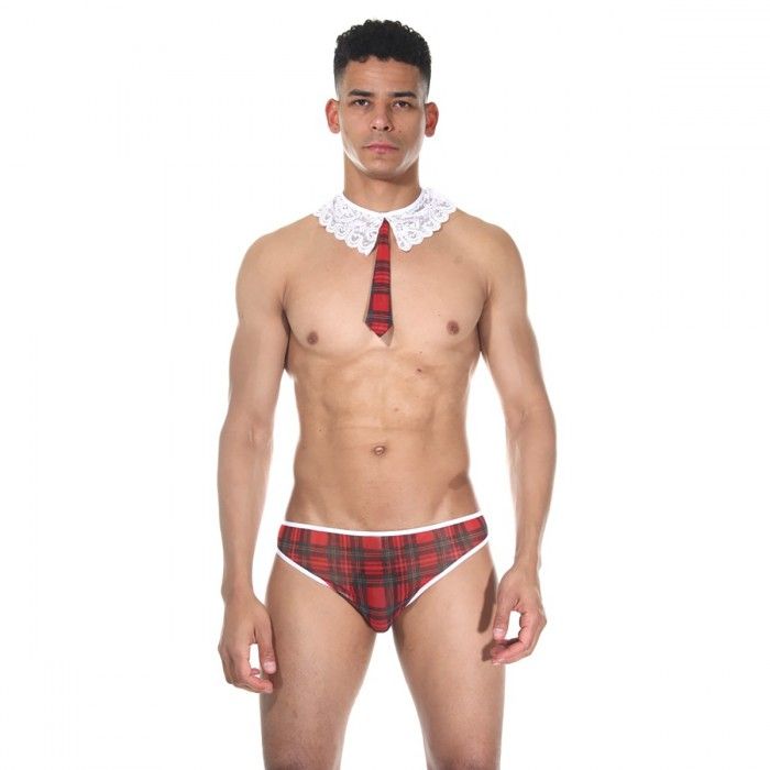 Костюм ученика для мужчин, состоящий из трусов-тонгов в клетку и из белого кружева, и красного клетчатого галстука с белым кружевным воротничком. В комплекте: трусы, воротник с галстуком. Мужской игровой костюм ученика