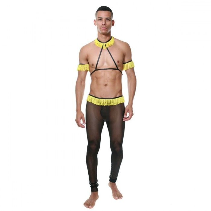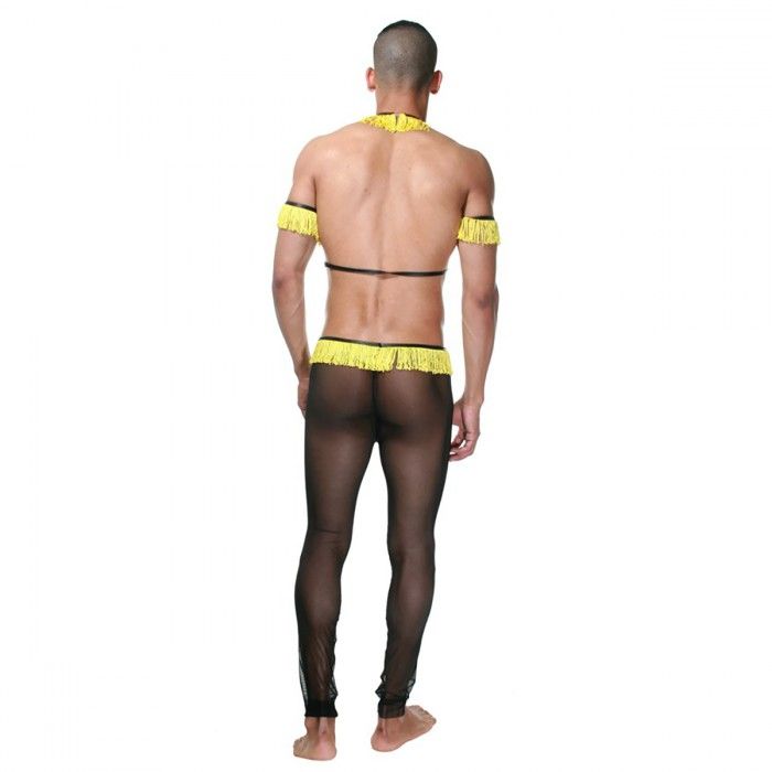 Мужской костюм танцора, состоящий из штанов из полупрозрачной легкой черной ткани и аксессуаров на руки, шею и грудь из черных ремешков и желтой бахромы. В комплекте: штаны, воротник со стрепами, 2 нарукавника. Мужской костюм «Танцор» с бахромой