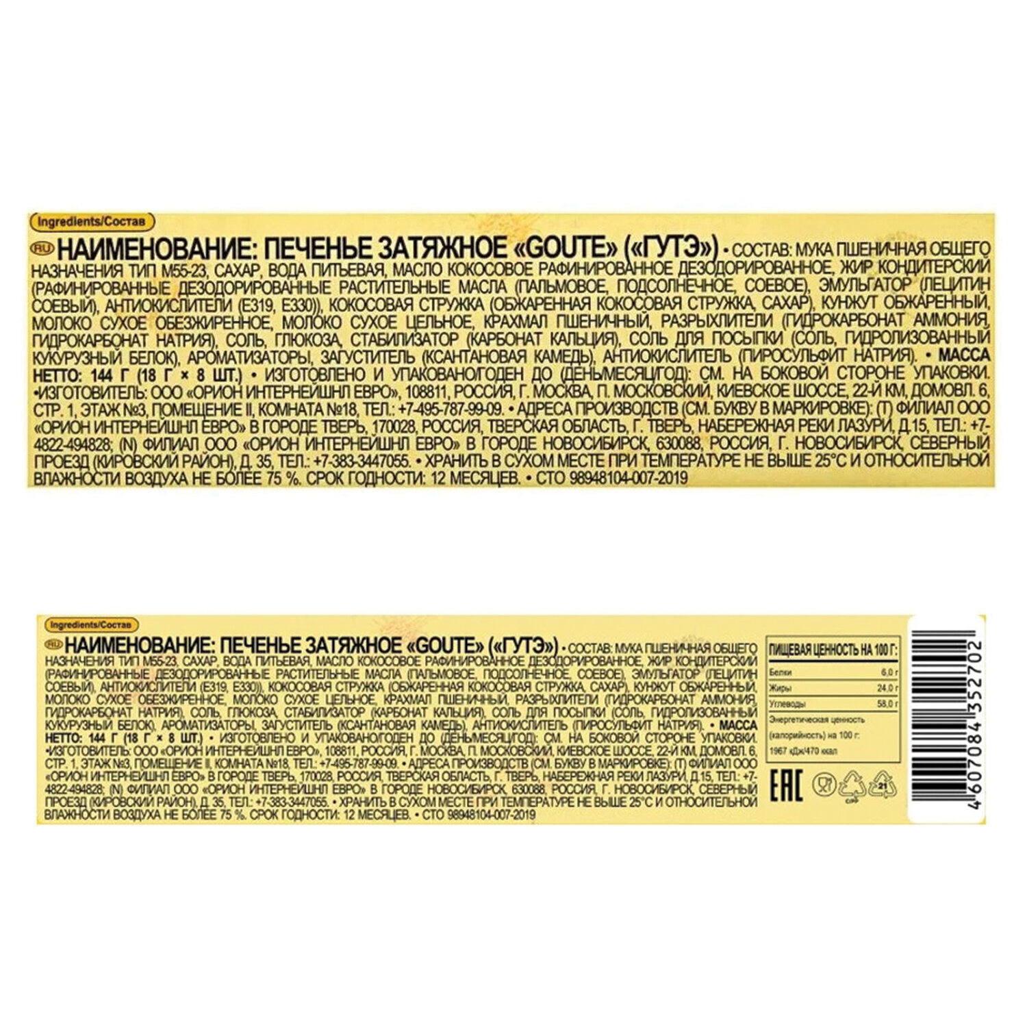 Удобная упаковка позволяет брать печенье с собой в дорогу, на прогулку или в школу. Печенье ORION "GOUTE" затяжное, 144 г, О0000011959