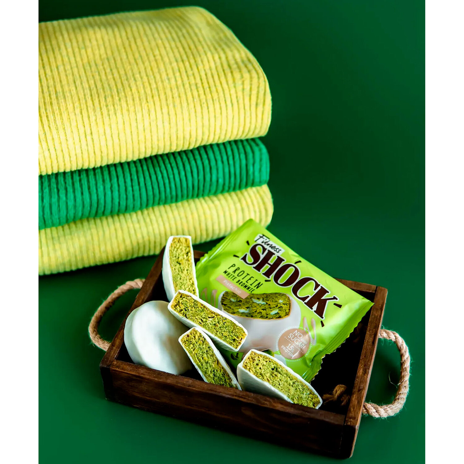 - Печенье протеиновое FITNESSHOCK Брауни Белый шоколад и фисташки, 10 шт. по 50 г в шоу-боксе, 27668
