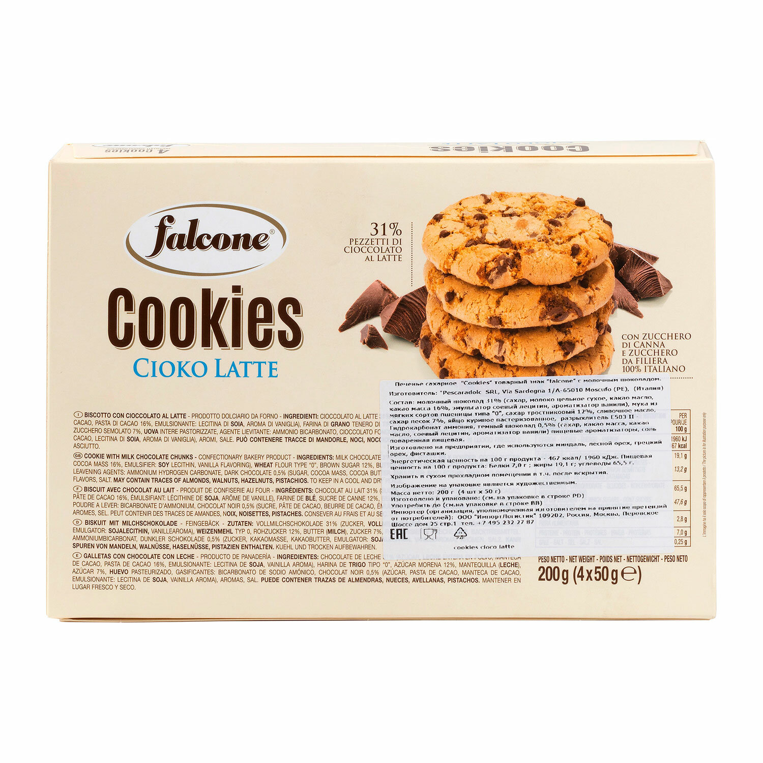 - Печенье в индивидуальной упаковке сахарное FALCONE "Cookies" с молочным шоколадом, 200 г, ИТАЛИЯ, MC-00013546