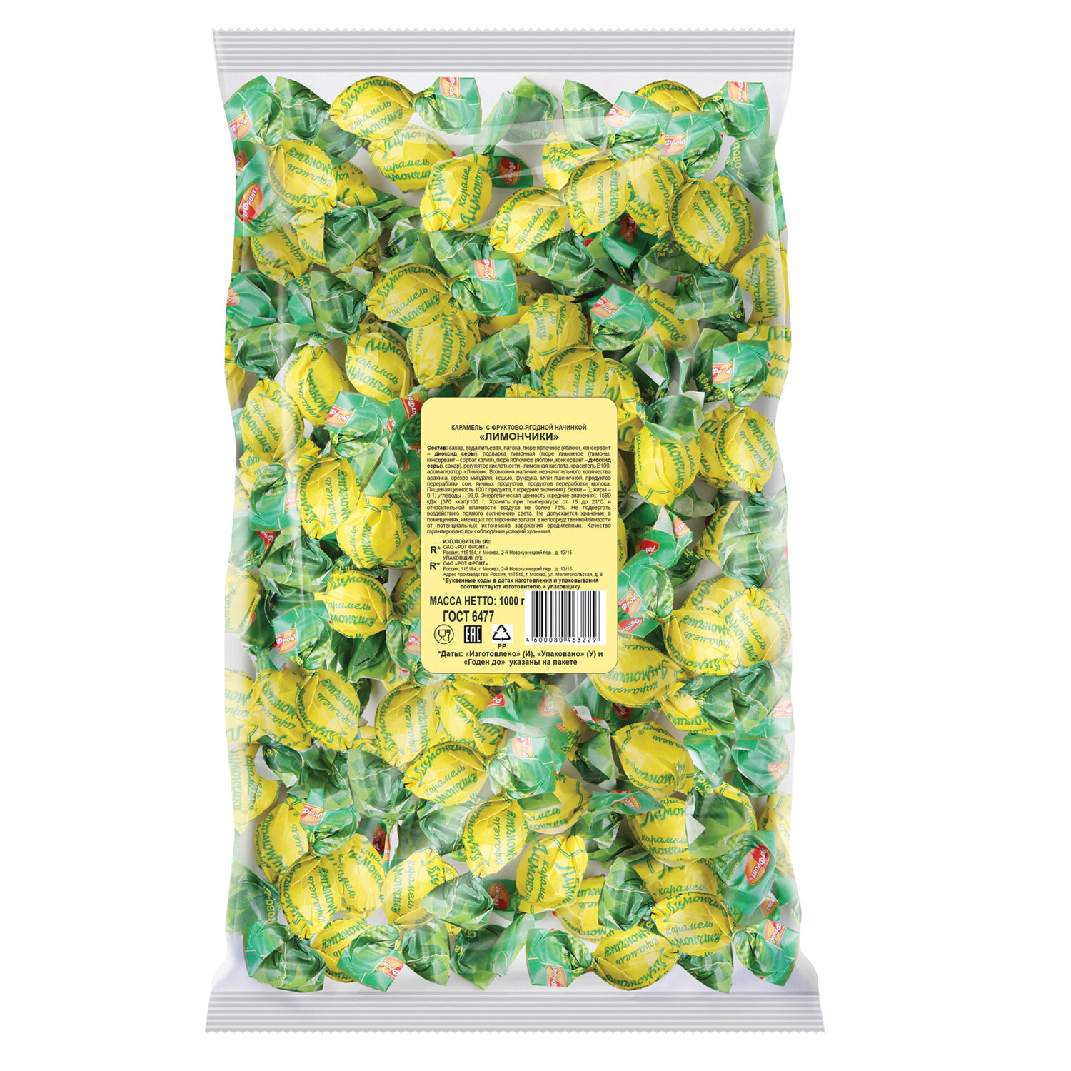 Состав: сахар, вода питьевая, патока, пюре яблочное (яблоки, консервант – диоксид серы), подварка лимонная (пюре лимонное (лимоны, консервант – сорбат калия), пюре яблочное (яблоки, консервант – диоксид серы), сахар), регулятор кислотности – кислота лимонная, краситель Е100, ароматизатор идентичный натуральному – «Лимон». Карамель РОТ ФРОНТ "Лимончики", с фруктовой начинкой, 1 кг, пакет, РФ14200