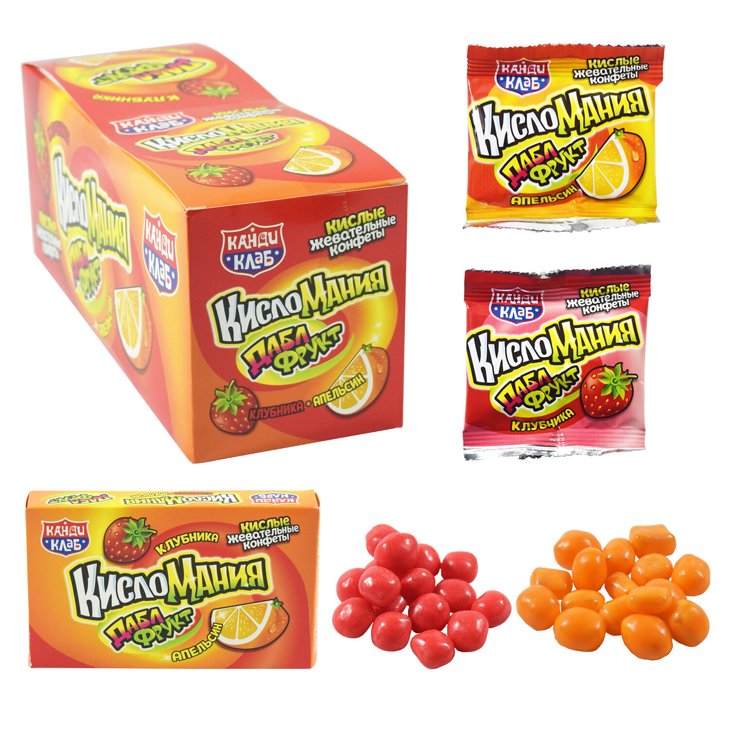 - Жевательные конфеты "Кисломания дабл фрукт" апельсин и клубника, 14 г, КАНДИ КЛАБ, CHW040