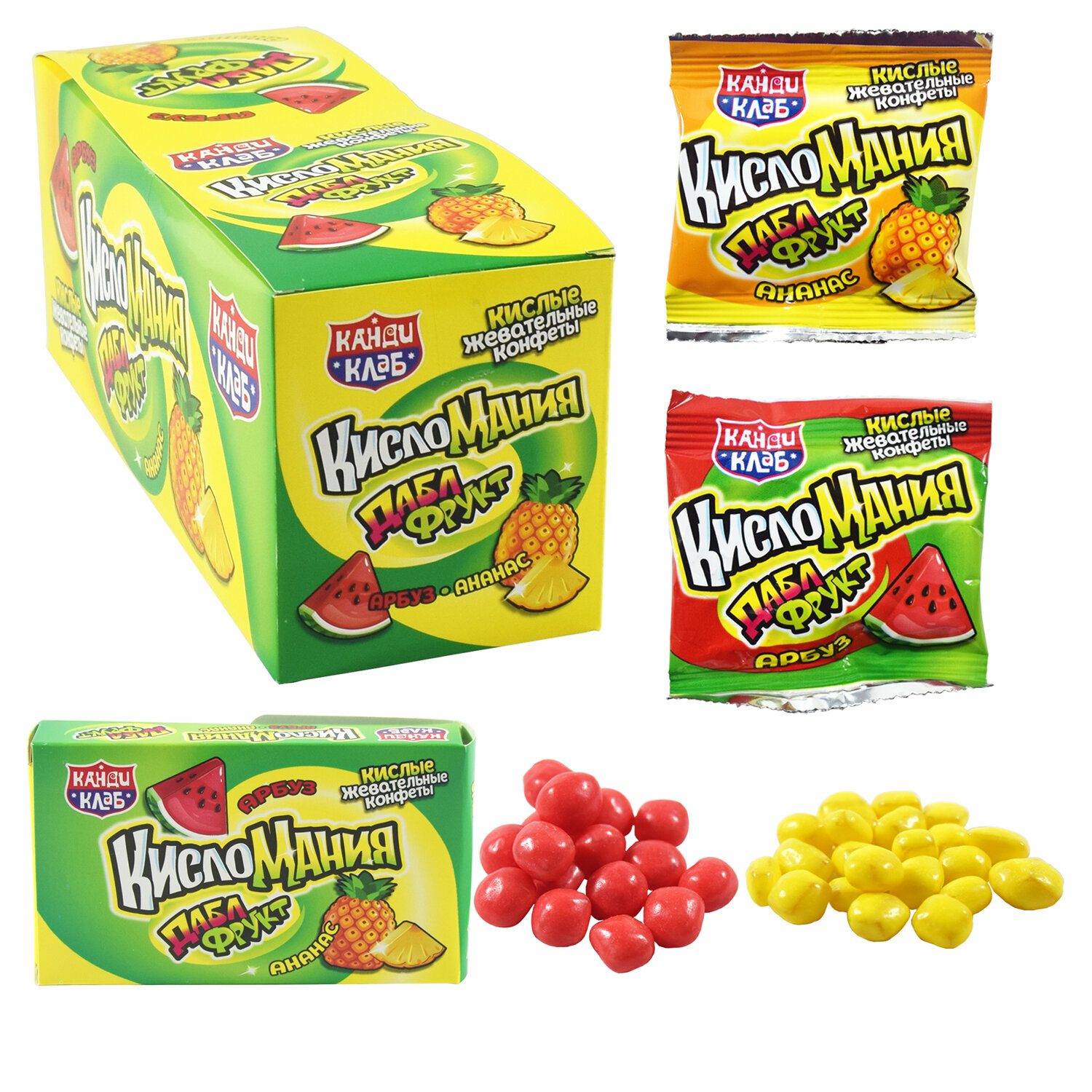- Жевательные конфеты "Кисломания дабл фрукт" арбуз и ананас, 14 г, КАНДИ КЛАБ, CHW041