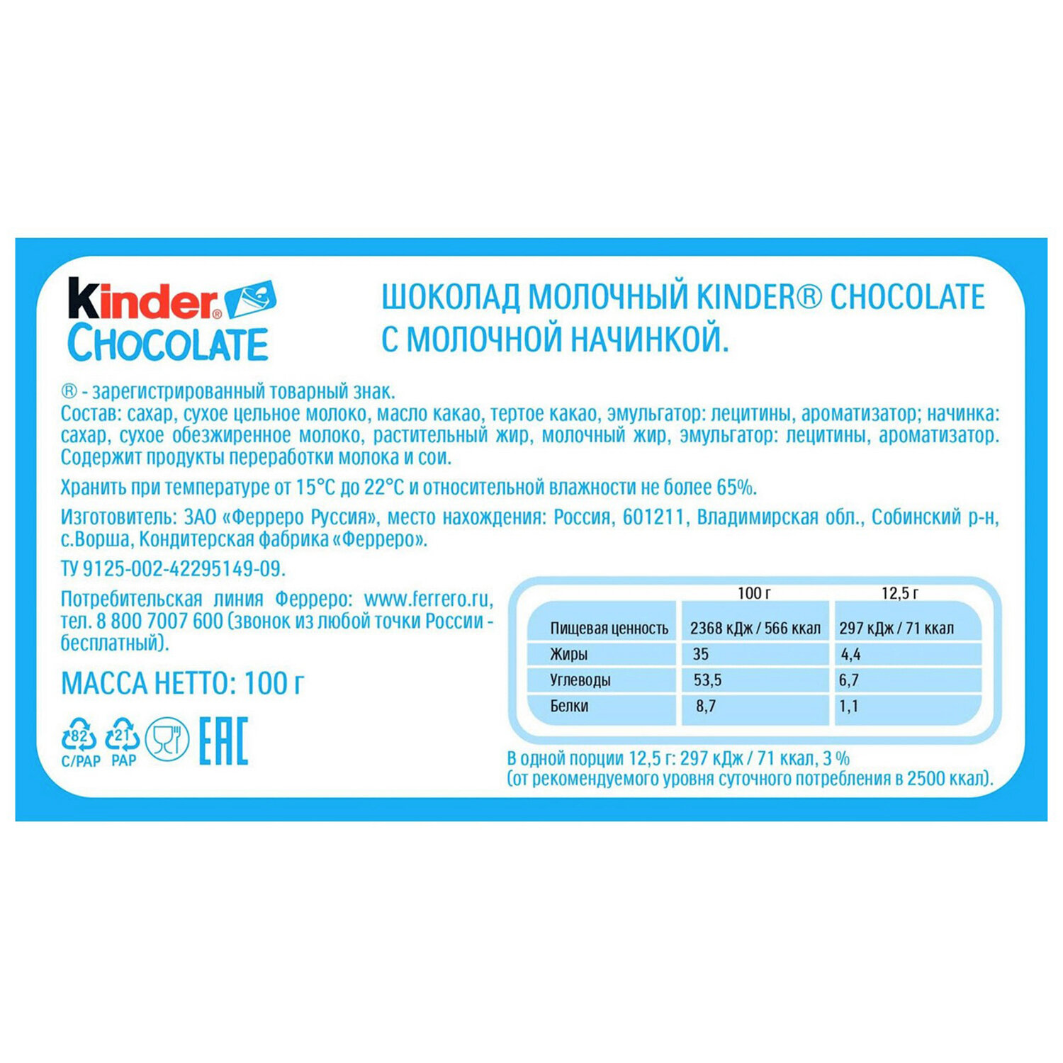 Состав: сахар, сухое цельное молоко, масло какао, тертое какао, эмульгатор: лецитины, ароматизатор; начинка: сахар, сухое обезжиренное молоко, растительный жир, молочный жир, эмульгатор: лецитины, ароматизатор. Содержит продукты переработки молока и сои. Шоколад KINDER с молочной начинкой 100 г, порционный, 9020000000700