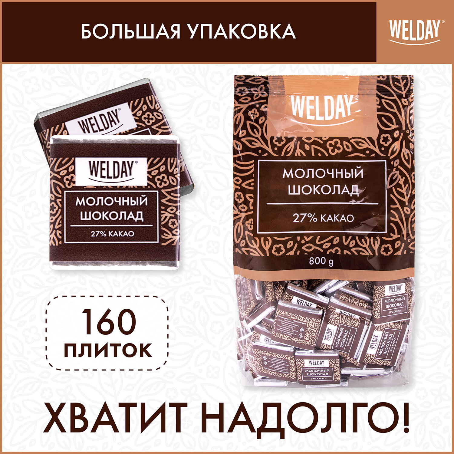 *товар продается на вес (количество плиток в упаковке может варьироваться ±2 шт. от заявленного) Шоколад порционный высшего качества WELDAY (ВЭЛДЭЙ) "Молочный 27%", 800 г (160 плиток по 5 г), пакет, 622406