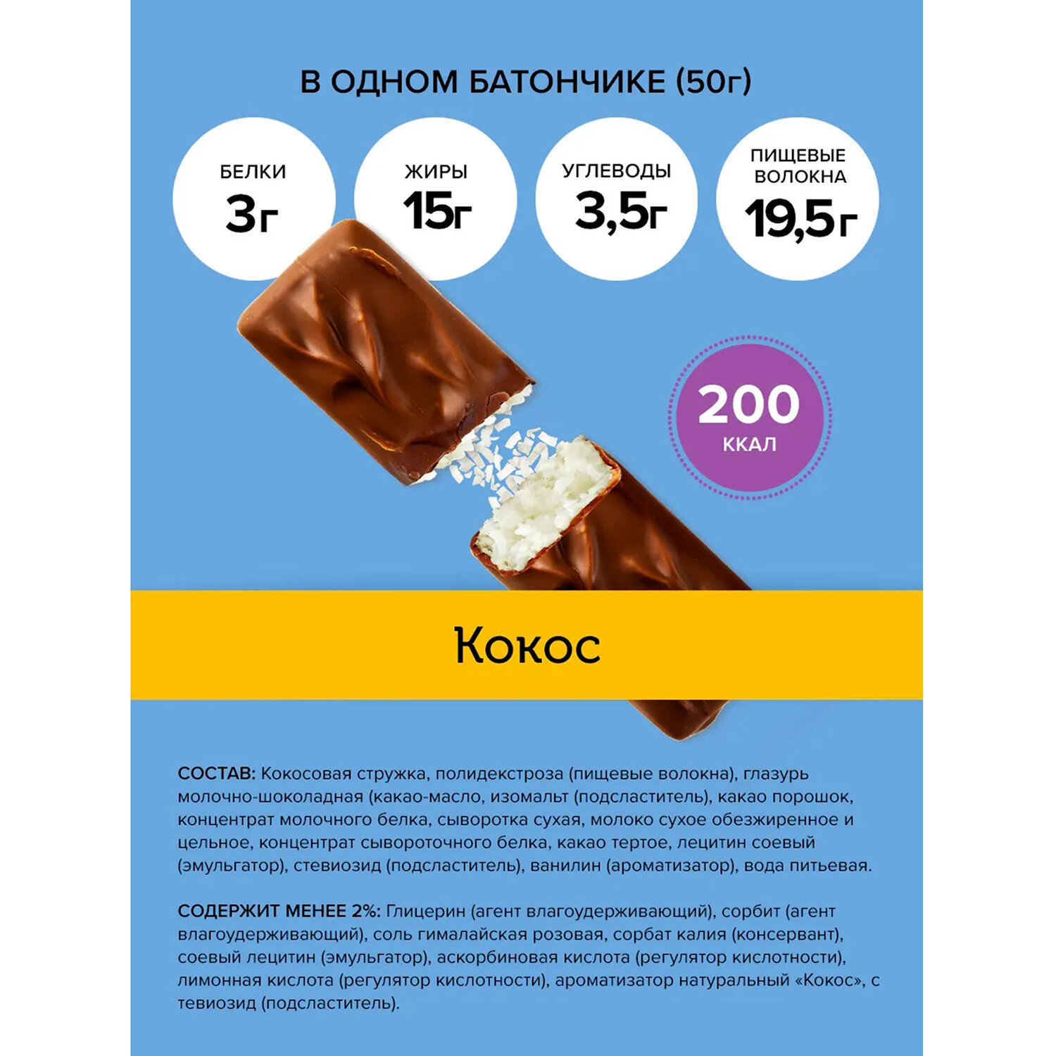 Состав: кокосовая стружка, глазурь молочно-шоколадная (какао-масло, изомальт (подсластитель), какао порошок, концентрат молочного белка, сыворотка сухая, молоко сухое обезжиренное и цельное, концентрат сывороточного белка, какао тертое, лецитин соевый (эмульгатор), стевиозид (подсластитель), ванилин (ароматизатор)), полидекстроза (пищевые волокна), изомальтоолигосахарид (подсластитель), вода питьевая.