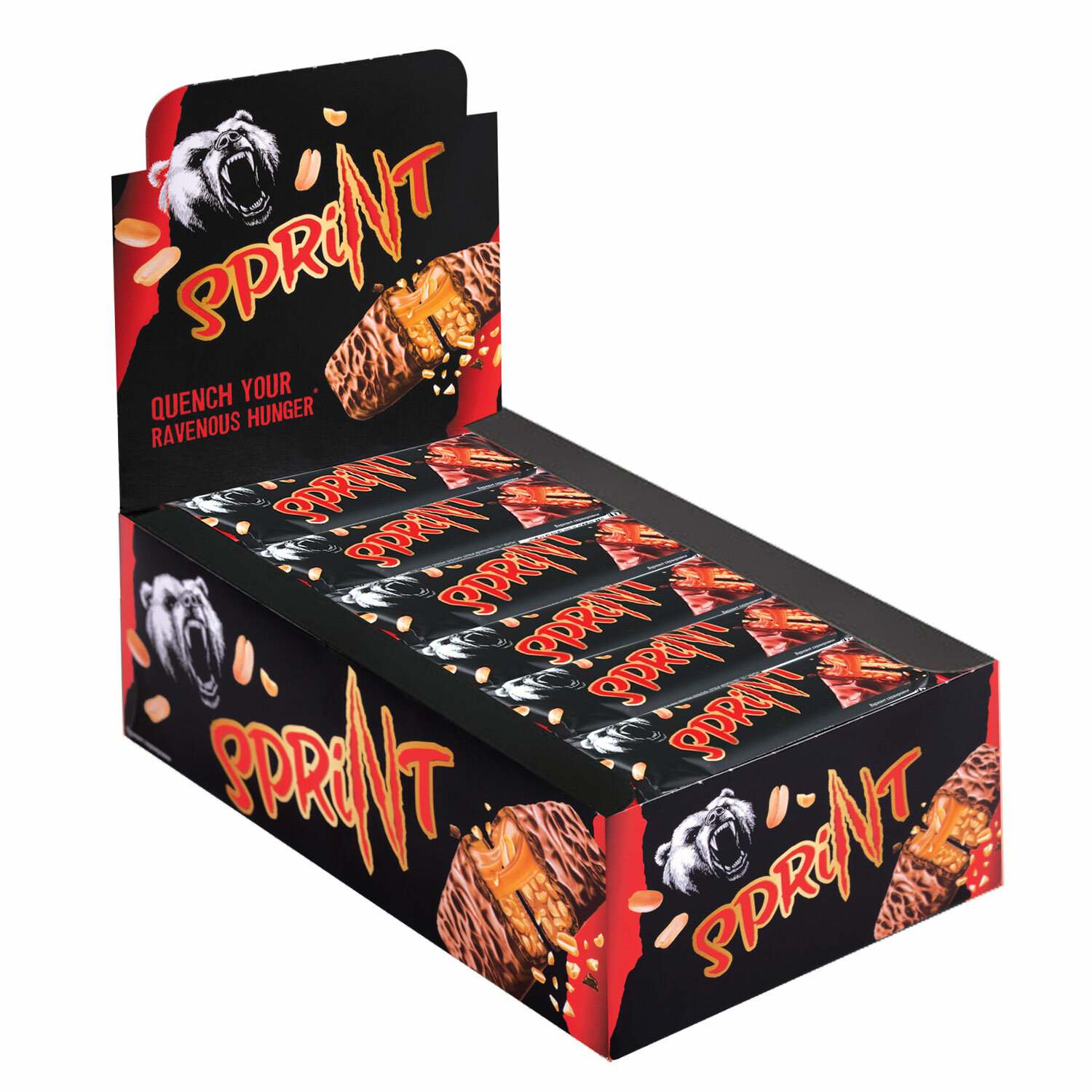 Батончик из мягкой карамели и жареного арахиса, покрытый глазурью. Шоколадный батончик "СПРИНТ", мягкая карамель и арахис в шоколадной глазури, 50 г, в шоубоксе, КЗ1389