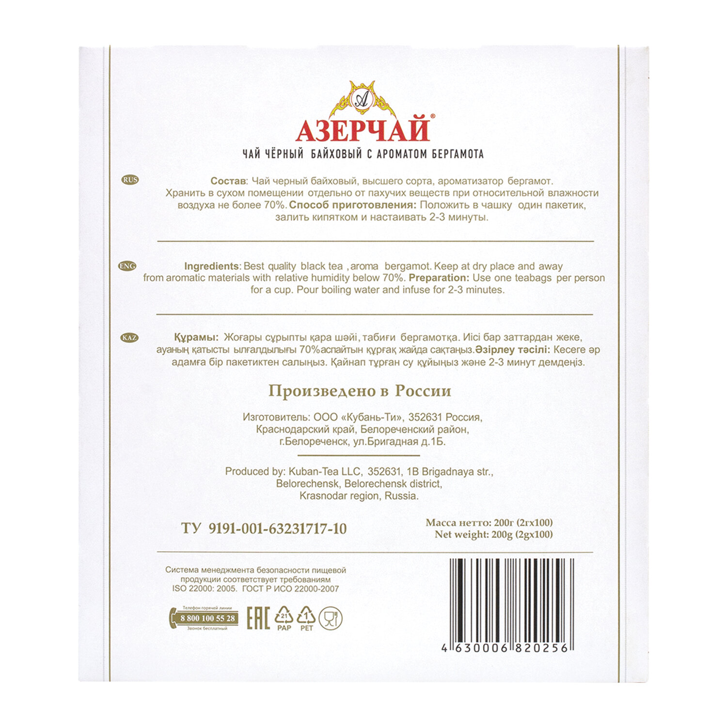 Срок хранения - 1095 дней. Чай АЗЕРЧАЙ черный с бергамотом, 100 пакетиков по 2 г, 419830