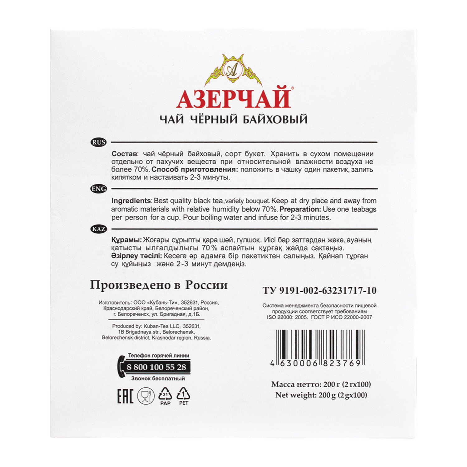 Срок хранения – 1096 дней. Чай АЗЕРЧАЙ "Букет" черный, 100 пакетиков по 2 г, 419831