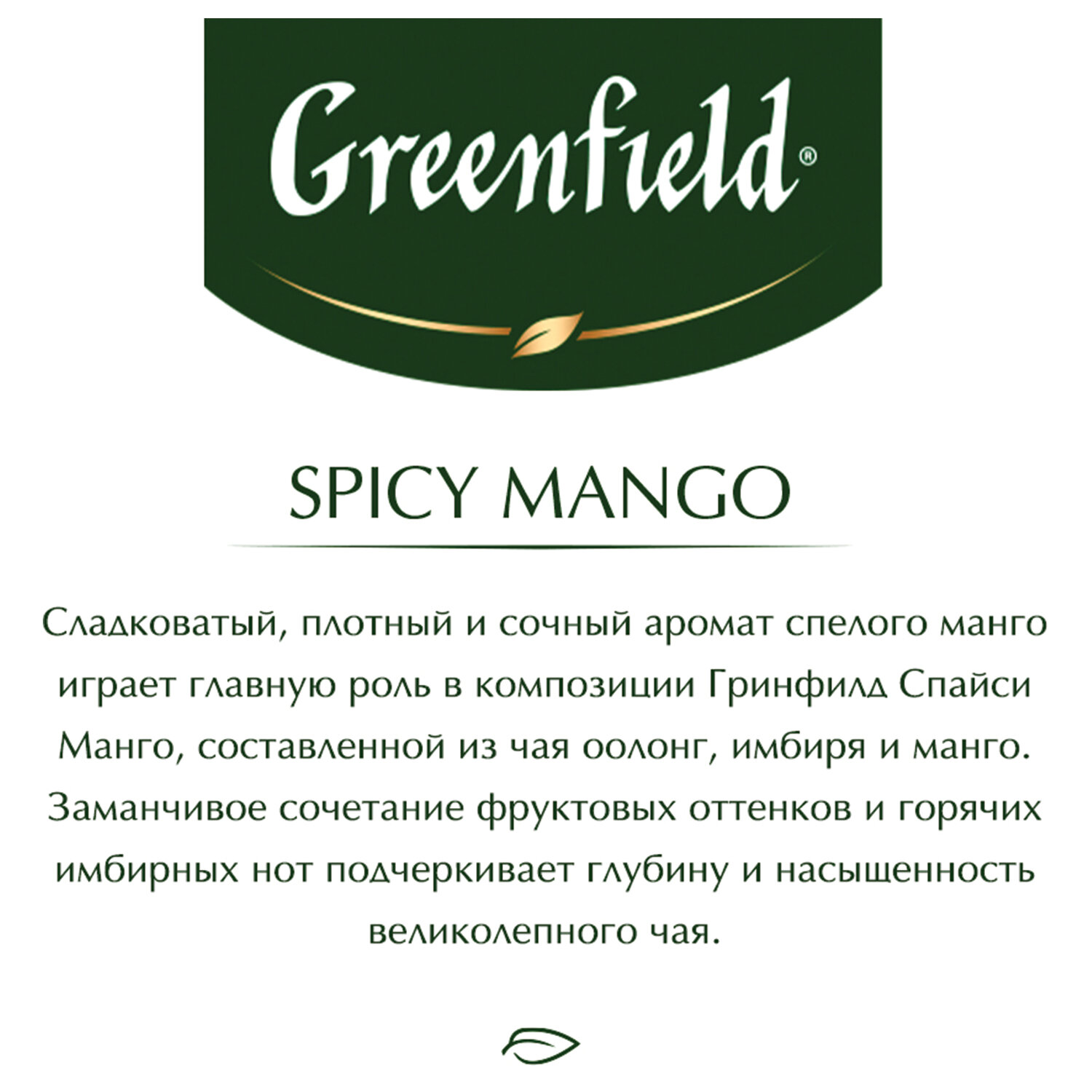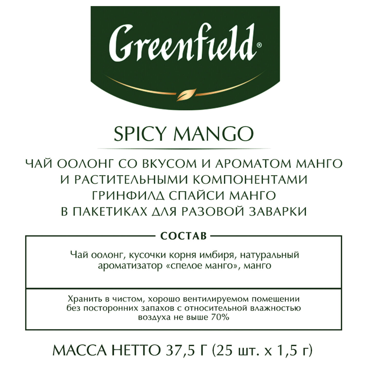 Состав: Чай оолонг, кусочки корня имбиря, натуральный ароматизатор t;спелое мангоt;, манго. Чай GREENFIELD "Spicy Mango" зеленый с манго, 25 пакетиков по 1,5 г, 1725-10