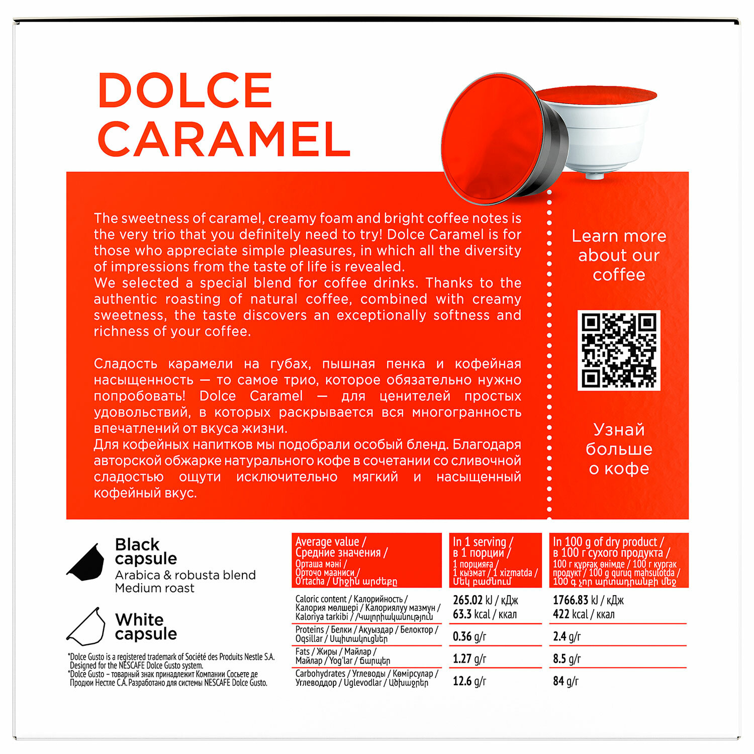 Состав: кофе жареный молотый, заменитель сливок на растительной основе (кукурузный сироп, гидрогенизированное кокосовое масло, регуляторы кислотности (цитрат калия 3-замещенный, гидрокарбонат натрия), молочный белок, обезжиренное молоко, эмульгаторы (E471, E472e, E481), агент антислеживающий (карбонат кальция), сахар, агент желирующий (хлорид калия), сахарный сироп, подсластитель (стевия), молочный кальций, уплотнитель (хлорид магния)), сливки растительные t;Кримерt; (кукурузный сироп, гидрогенизированное кокосовое масло, обезжиренное молоко, загуститель (мальтодекстрин), сывороточный протеин, регуляторы кислотности (гидрокарбонат калия, фосфат калия, яблочная кислота), агент антислеживающий (диоксид кремния)), ароматизатор карамель. Кофе в капсулах COFFESSO "Dolce Caramel" для кофемашин Dolce Gusto, 8 порций, 102155