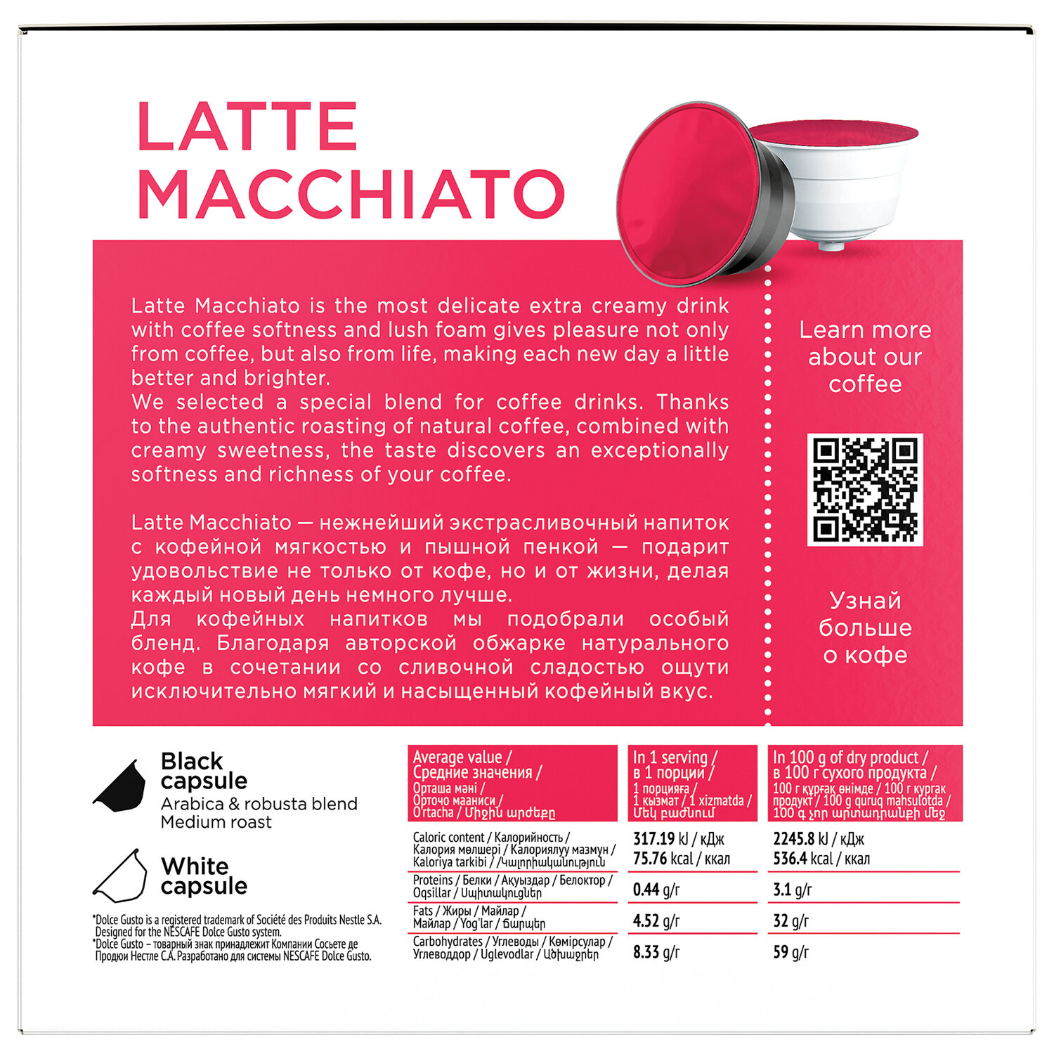 В молочной смеси: массовая доля (молочного) жира – 23,4%, сахароза – 10 г в 100 г. Кофе натуральный жареный молотый. Кофе в капсулах COFFESSO "Latte Macchiato" для кофемашин Dolce Gusto, 8 порций, 102151