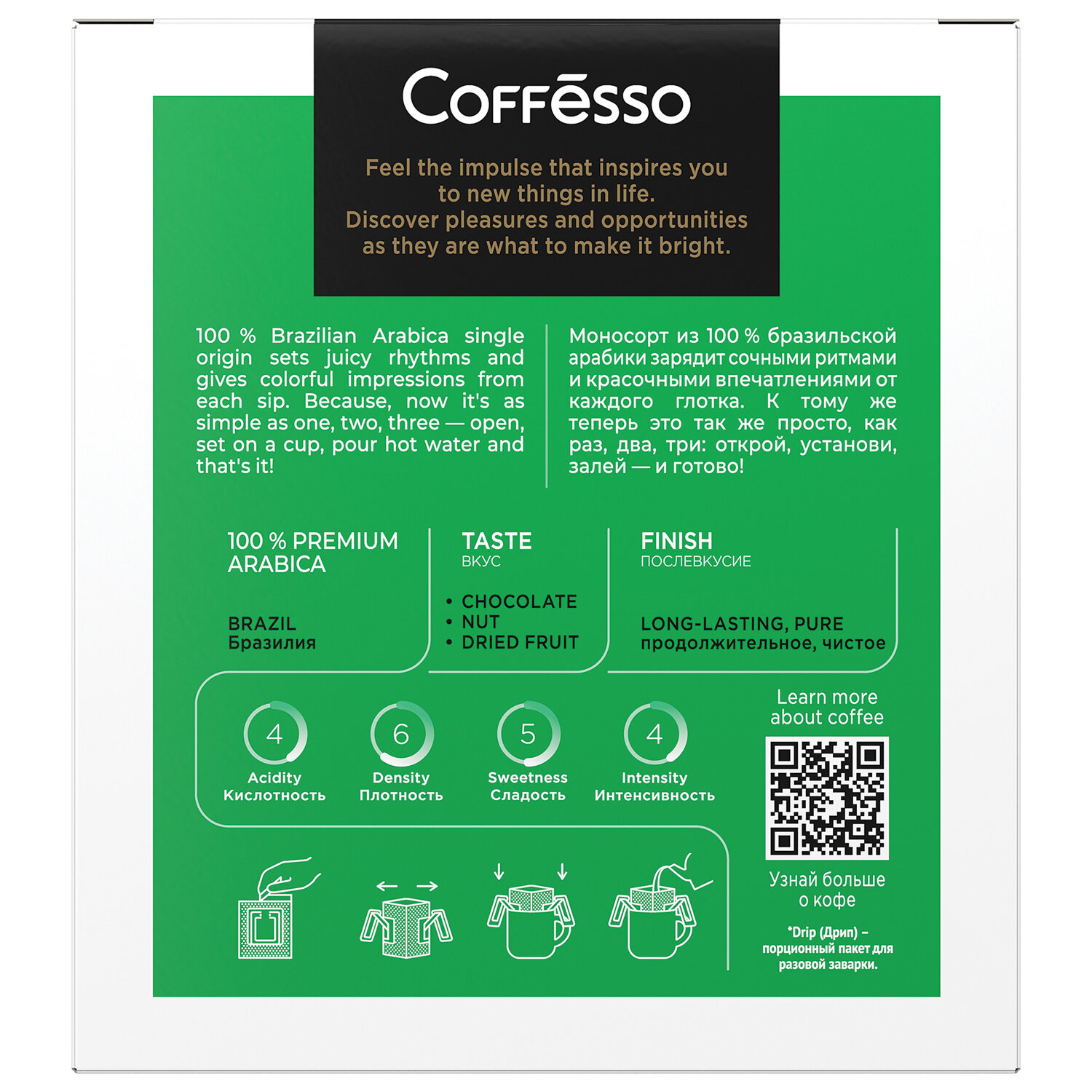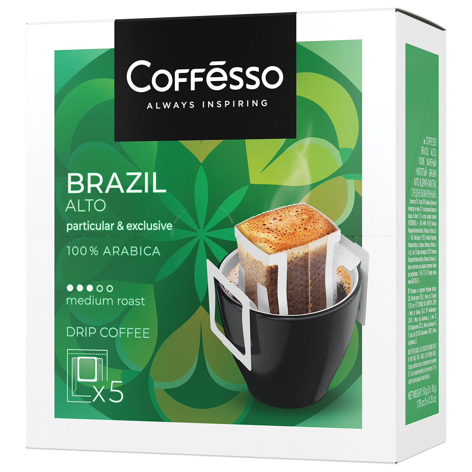 Состав: 100 арабика. Кофе в дрип-пакетах COFFESSO "Brazil Alto" 5 порций по 10 г, 102542