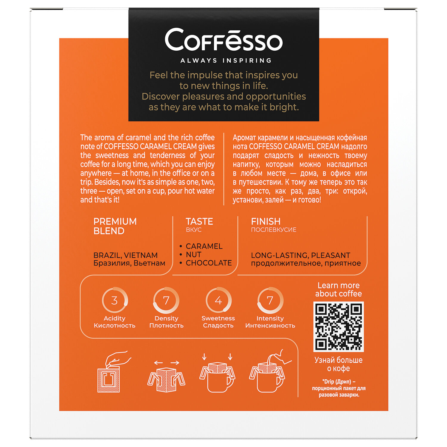 Состав: молотый кофе, ароматизатор, карамель. Кофе в дрип-пакетах COFFESSO "Caramel Cream" 5 порций по 10 г, 102540