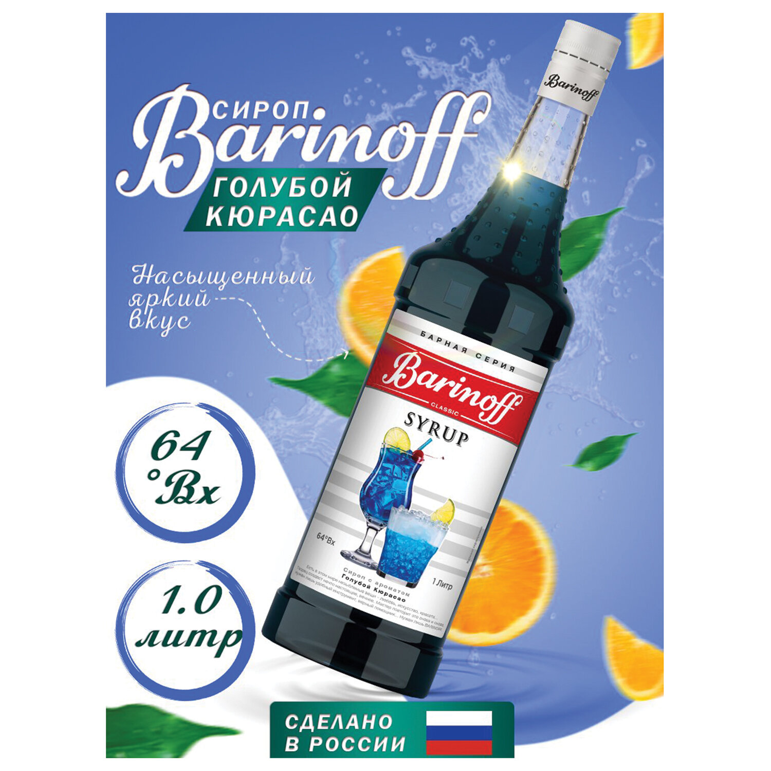 Энергетическая ценность на 100 г: 256 ккал. Сироп BARINOFF "Голубой кюрасао", 1 л, стеклянная бутылка, 1070