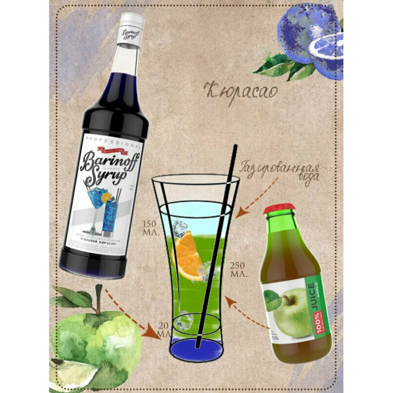 Состав: сахар, вода питьевая, концентрированные фруктовые соки (яблочный, виноградный), регулятор кислотности – винная кислота, ароматизаторы: «Апельсин», «Кюрасао», пищевые красители E132, E133, консервант – сорбат калия.
