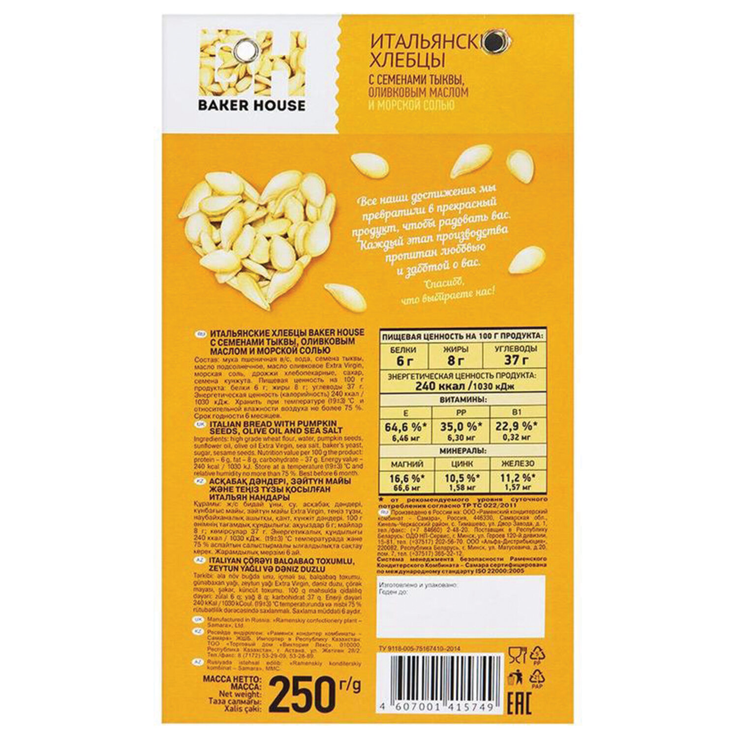 Хранить при температуре 19±3 °C и относительной влажности не более 75%. Хлебцы BAKER HOUSE "Итальянские", с семенами тыквы, 250 г, пакет, 5749