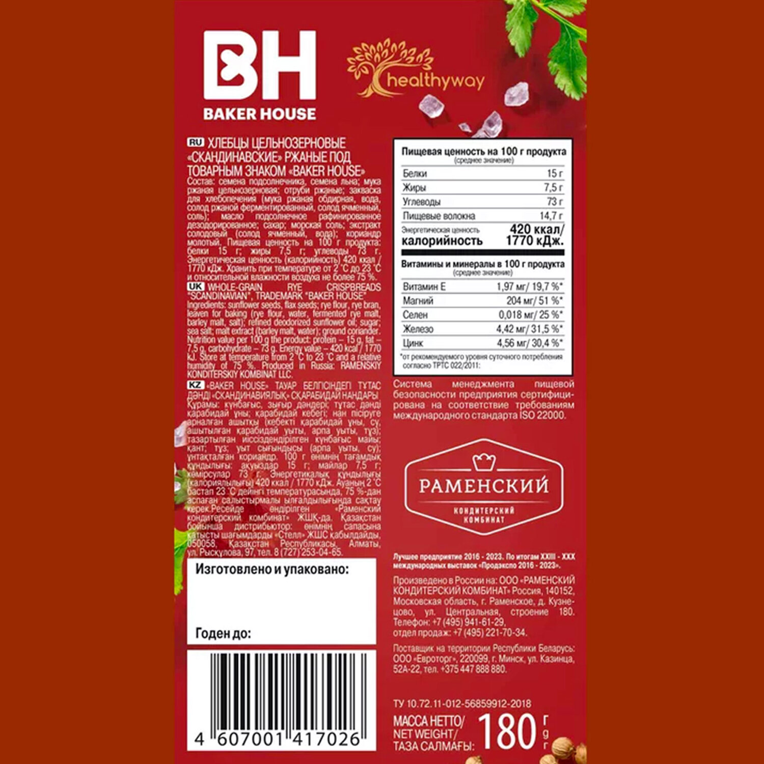 Состав: семена подсолнечника, кунжута, льна; мука ржаная цельнозерновая; отруби ржаные; закваска для хлебопечения (мука ржаная обдирная, вода, солод ржаной ферментированный, солод ячменный, соль); масло подсолнечное рафинированное дезодорированное; сахар; соль; экстракт солодовый (солод ячменный, вода); кориандр молотый. Хлебцы BAKER HOUSE скандинавские цельнозерновые ржаные, 180 г, 19927