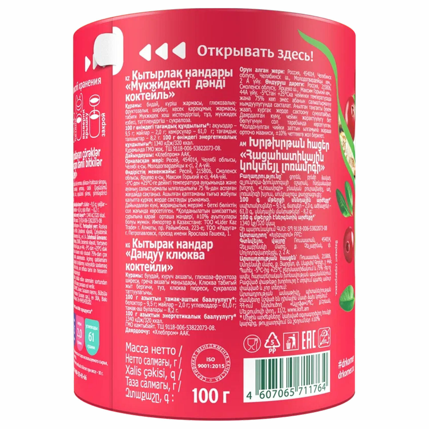 Состав: пшеница, крупа рисовая, сироп глюкозно-фруктозный, крупа гречневая ядрица, ароматизатор натуральный t;Клюкваt;, соль, пюре клюквенное, подсластитель сукралоза.