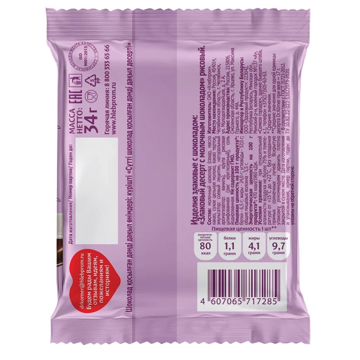 - Злаковый десерт DR.KORNER рисовый в молочном шоколаде, 34 г, пакет, 601090236