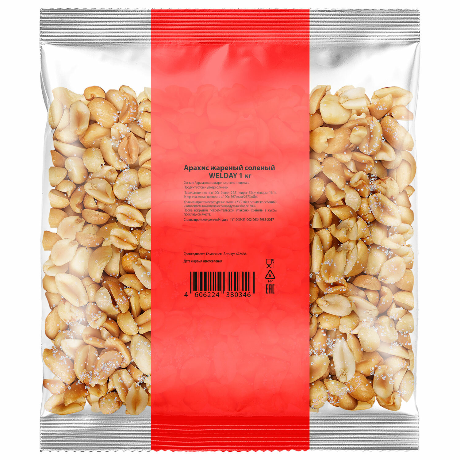 Срок годности – 12 месяцев. Арахис жареный соленый WELDAY (ВЭЛДЭЙ) 1 кг, 622468