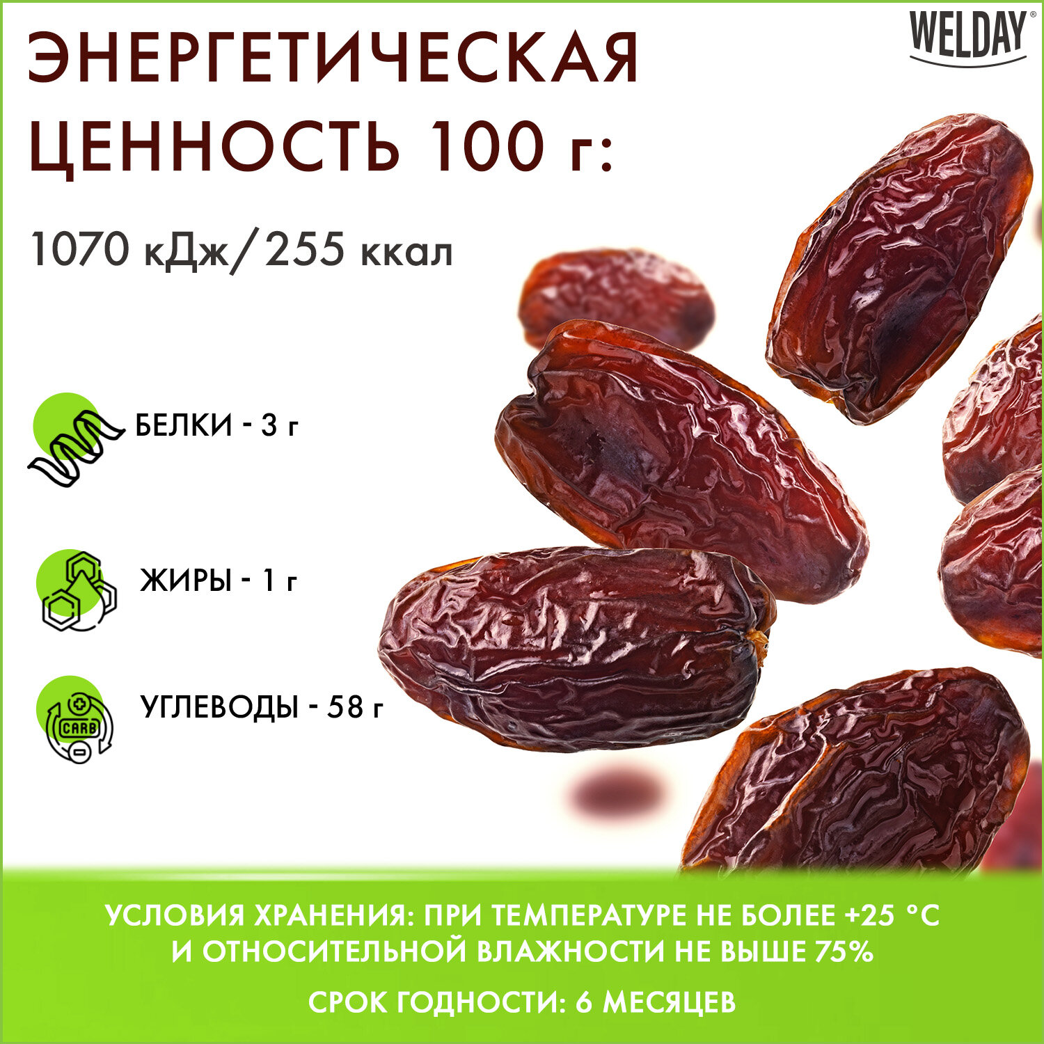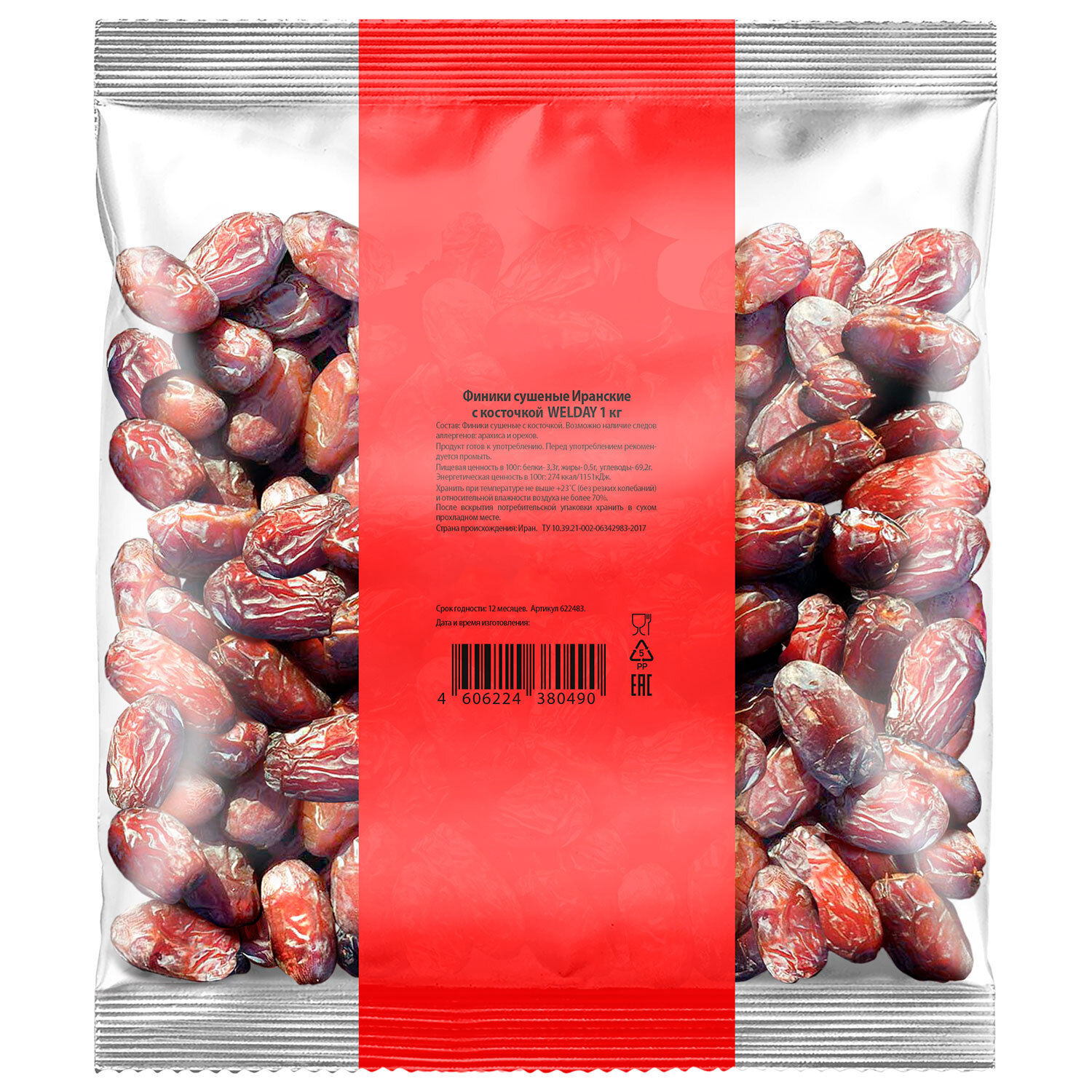 Срок годности – 12 месяцев. Финики сушеные Иранские с косточкой WELDAY (ВЭЛДЭЙ) 1 кг, 622483