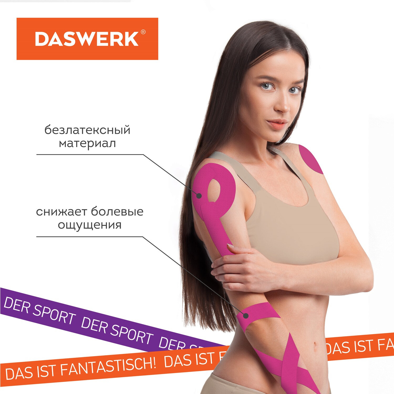 - надежно крепится на 3-5 дней. Кинезио тейп/лента для лица и тела, омоложение и восстановление, 5 см х 5 м, розовый, DASWERK, 680004
