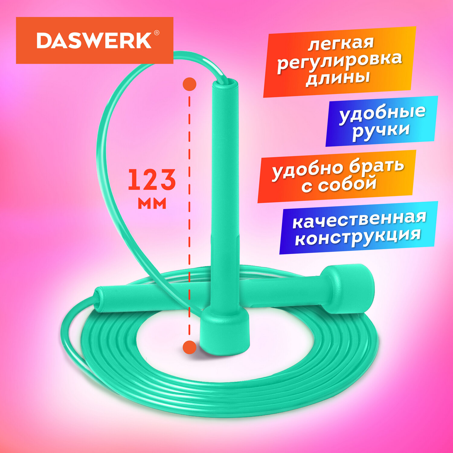 Занятия на скакалке доступны спортсмену любого возраста и любой физической подготовки. Возможность регулировки длины позволяет использовать скакалку как взрослым, так и детям. Легкий и компактный тренажер удобно брать с собой на тренировку, на отдых и в любую поездку. Скакалка спортивная 300 см, ПВХ, регулируемая длина, бирюзовая, DASWERK, 680028