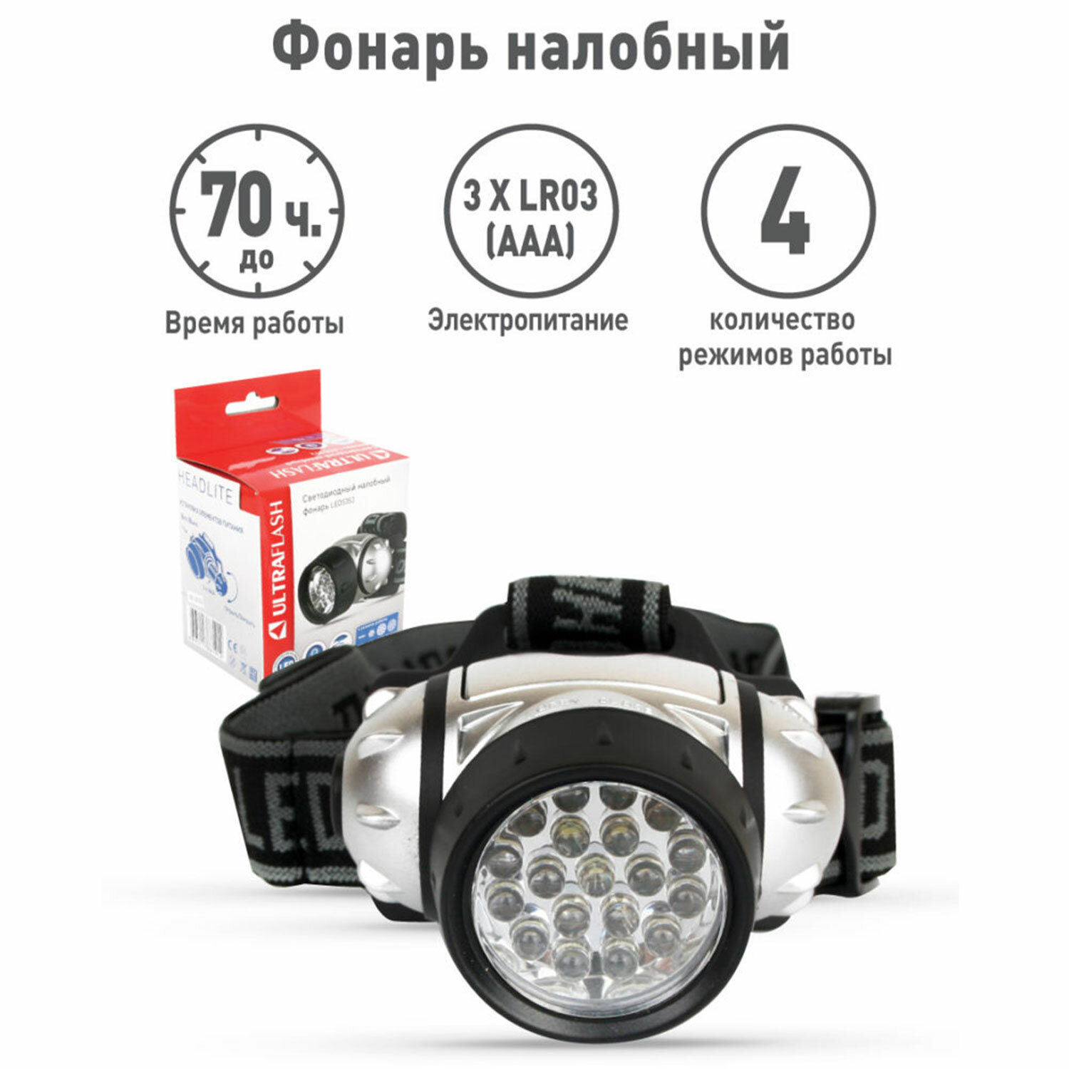 - Фонарь налобный ULTRAFLASH 19хLED, 4 режима, питание 3хААА (не в комплекте), LED5353