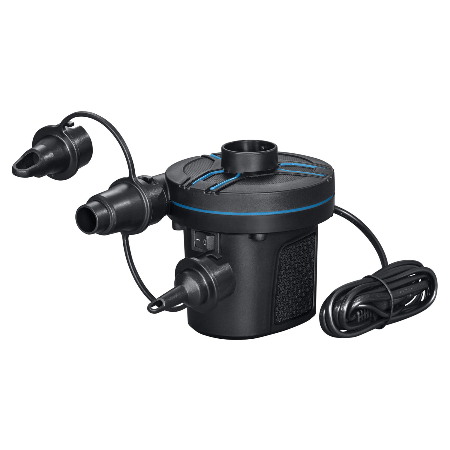 Этот воздушный насос поставляется с 3 многофункциональными адаптерами для клапанов, которые совместимы со многими изделиями, включая надувные матрасы, игрушки для бассейна, коврики для кемпинга, плотики и многое другое.