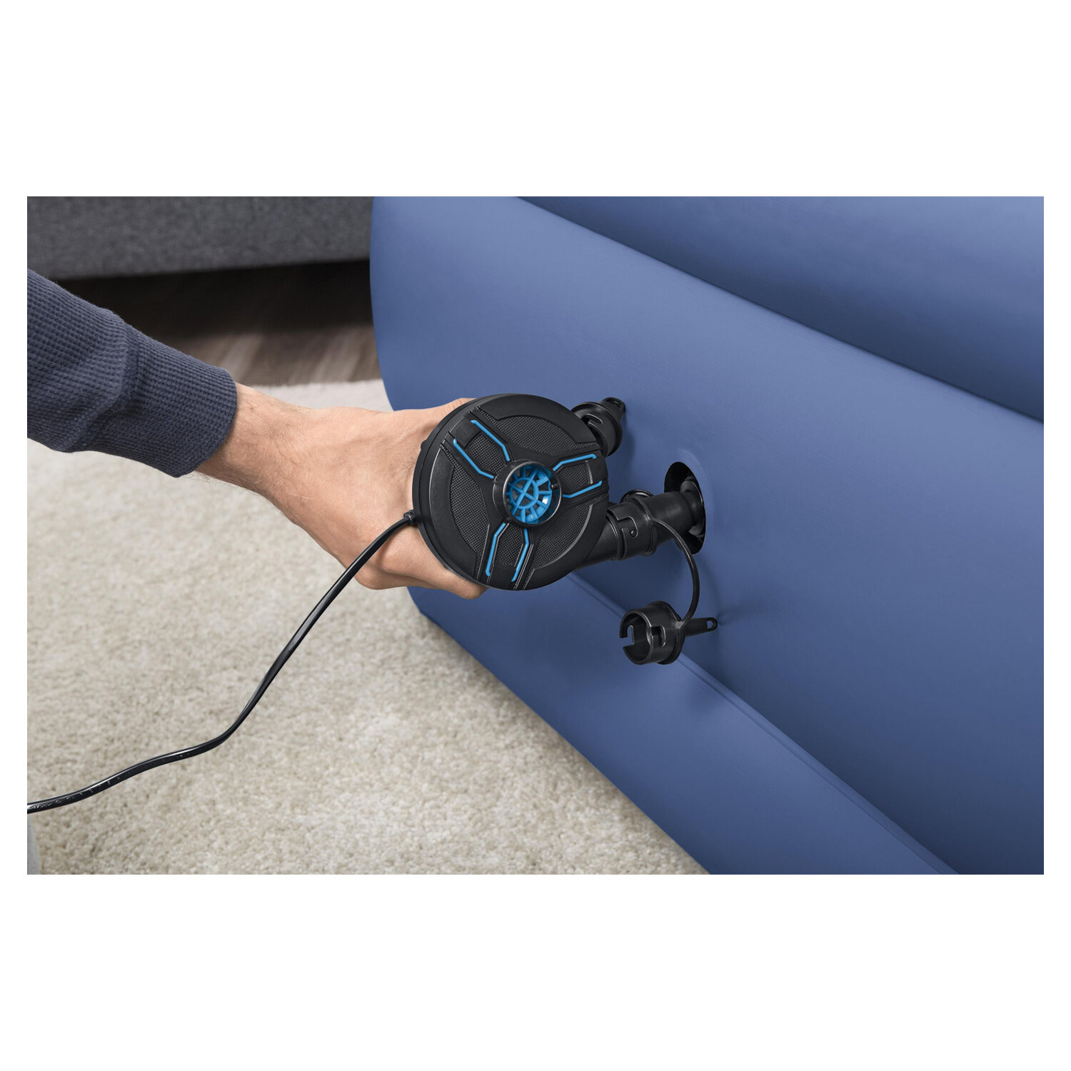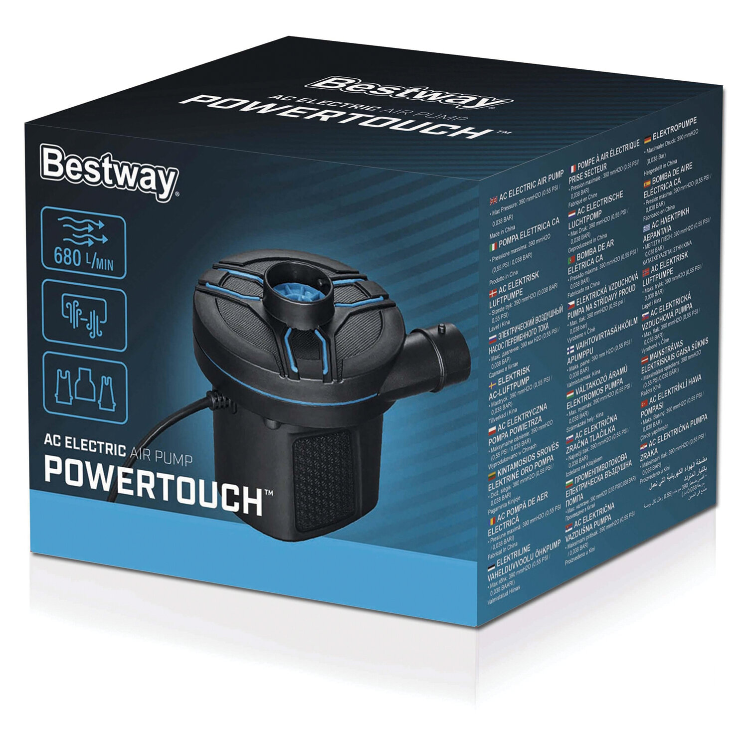 Этот электрический насос имеет привлекательный двухцветный дизайн и предназначен для обеспечения максимального потока воздуха в 680 л/минуту для быстрого, простого и легкого надувания и сдувания.
