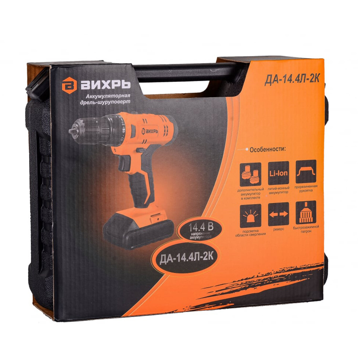 - Дрель-шуруповерт безударная АККУМУЛЯТОРНАЯ, с двумя аккумуляторами 2 Ач, 14,4 В, ВИХРЬ ДА-14,4Л-2К, 72/14/8