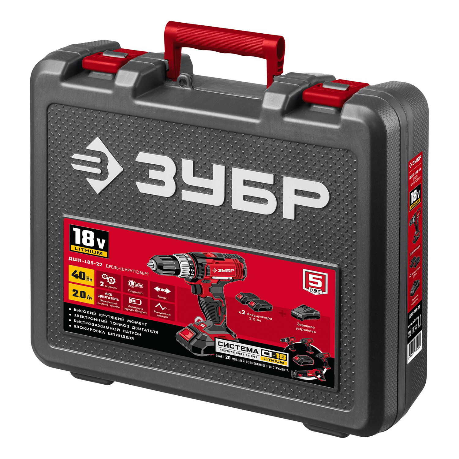 Кейс в комплекте для удобной переноски и хранения изделия и расходного инструмента. Дрель-шуруповерт безударная АККУМУЛЯТОРНАЯ, с двумя аккумуляторами 2 Ач, 18 В, ЗУБР ДШЛ-185-22
