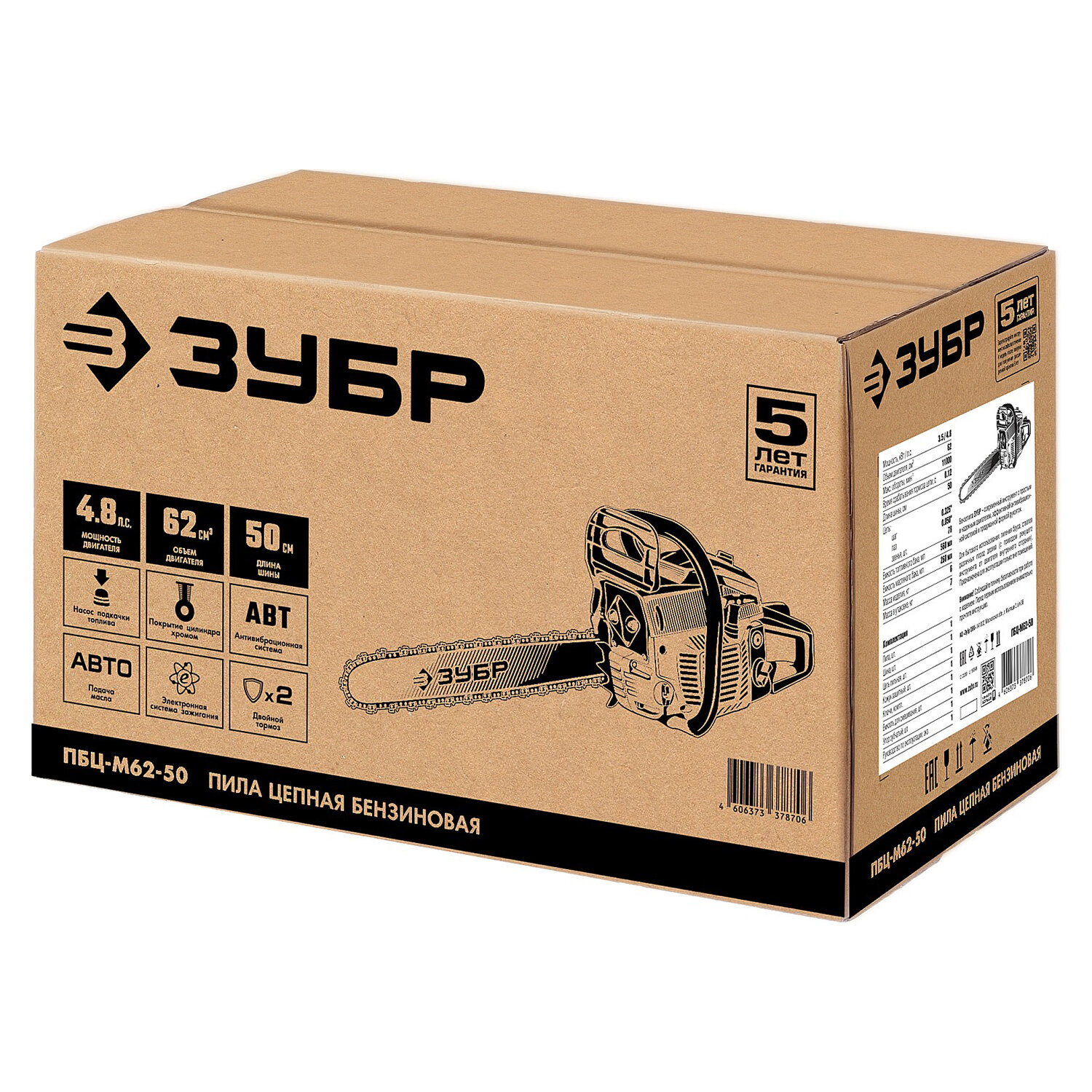 - Бензопила ЗУБР ПБЦ-М62-50, 3500 Вт, 11000 об/мин, объем двигателя 62 см3, 4,76 л.с., ПБЦ-М62-50
