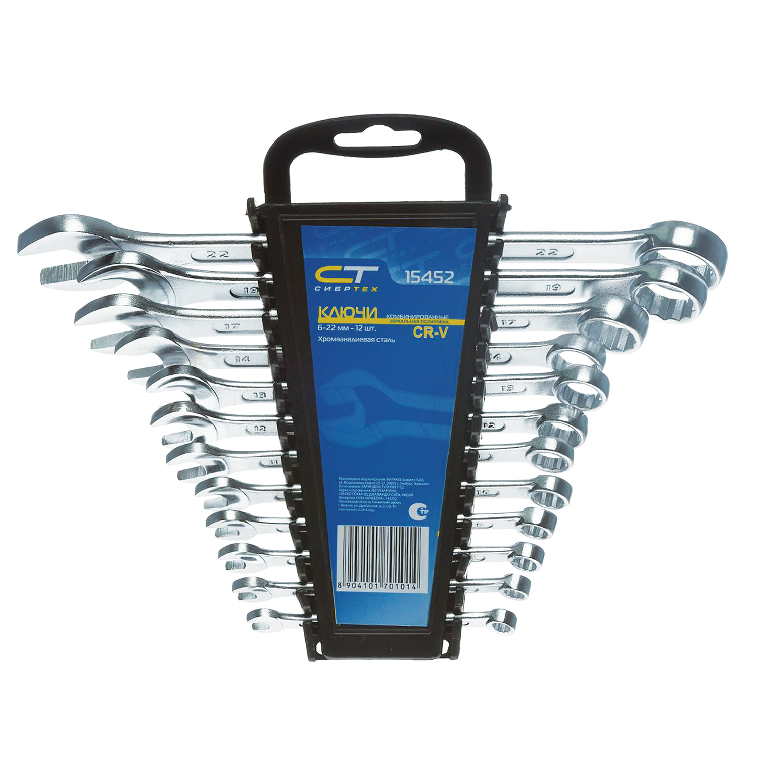 - Набор гаечных ключей комбинированных 6-22 мм, 12 шт., CrV, хромированные, держатель с подвесом, 15452