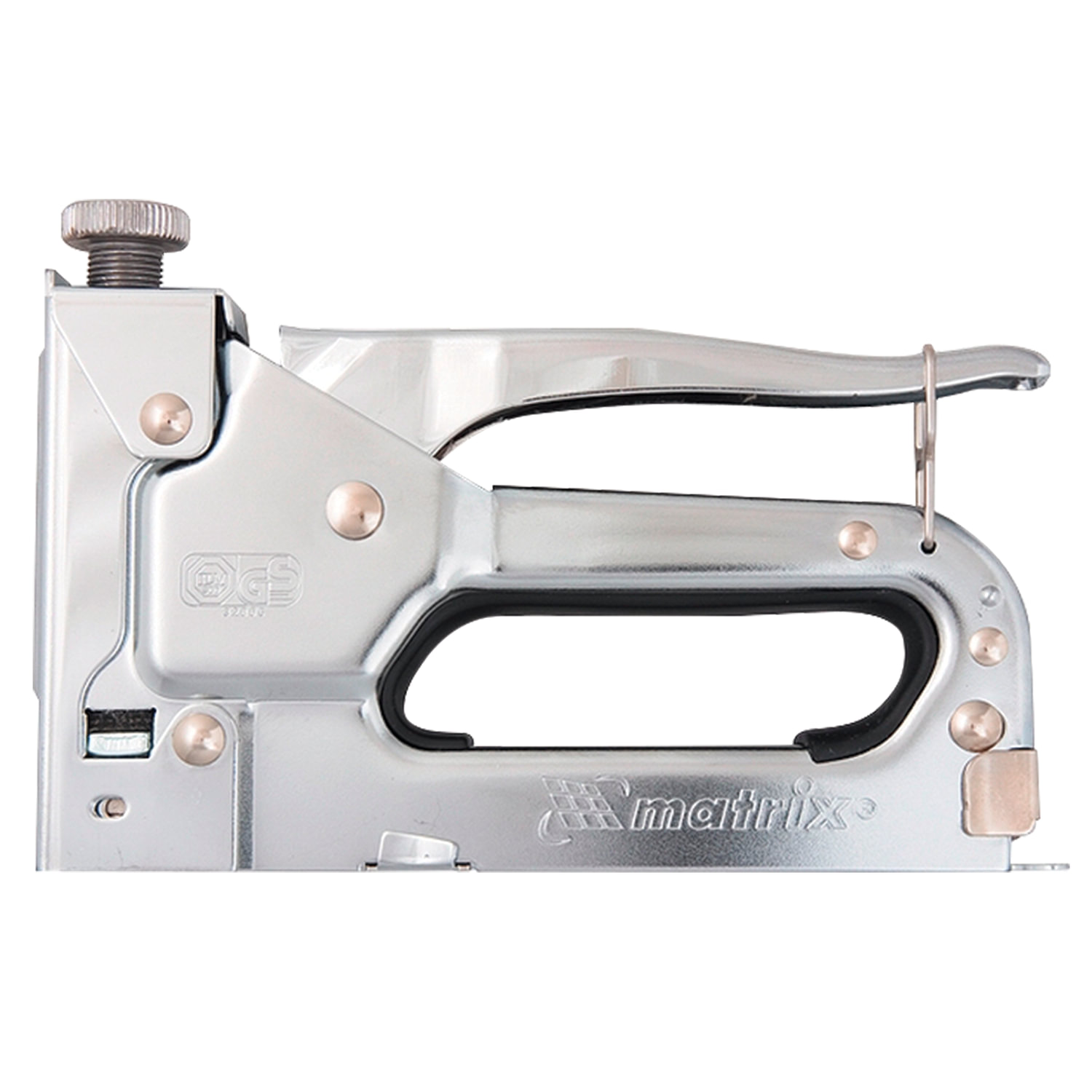 Степлер мебельный изготовлен из хромированной стали. Оснащен регулируемым механизмом контроля силы удара и глубины забивания. Используется со скобами (41206, 41208, 41210, 41212, 41214). Степлер мебельный MATRIX "MASTER", стальной, регулируемый, тип скобы: 53, 4-14 мм, 40902