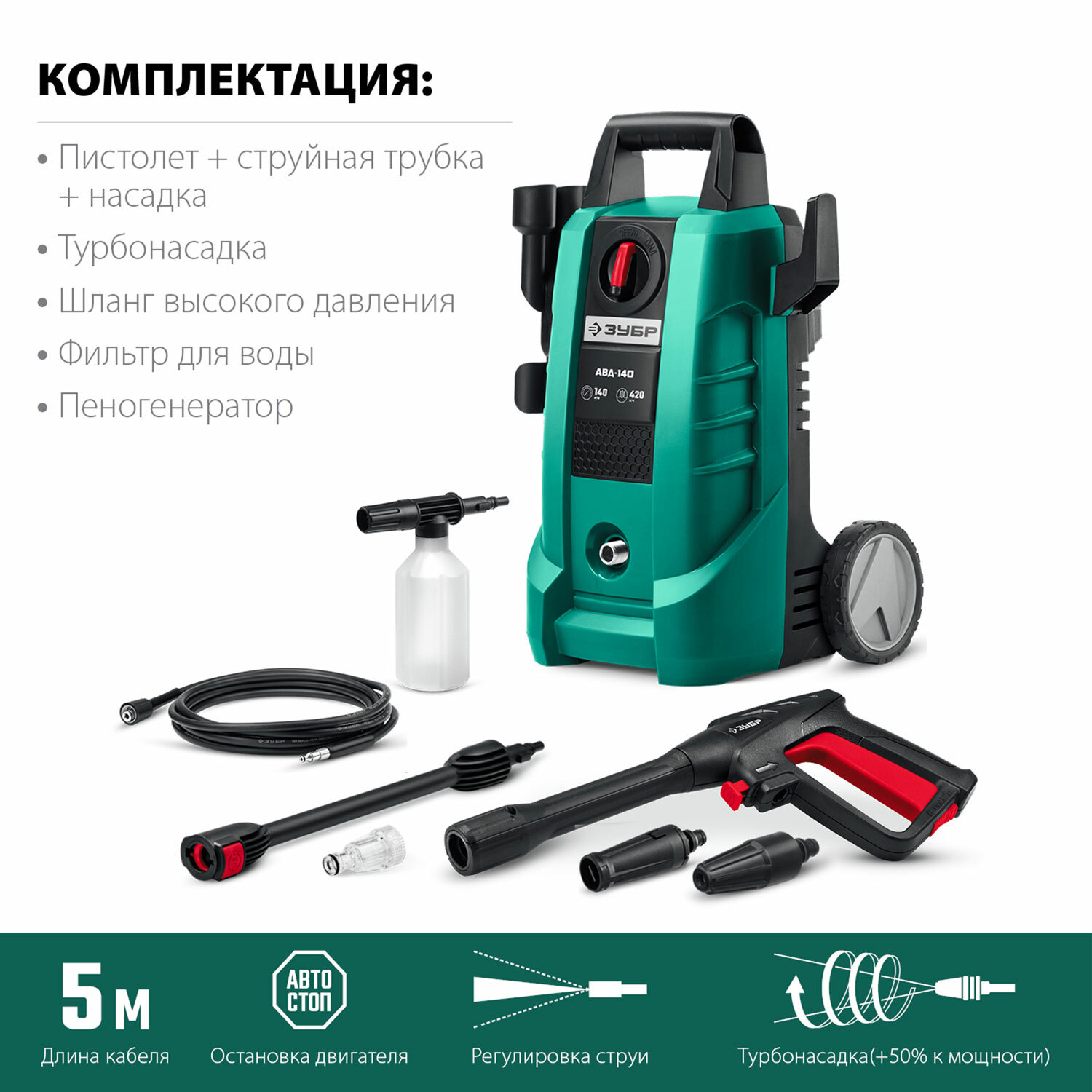 - Минимойка ЗУБР АВД-140, мощность 1,7 кВт, давление 140 бар, шланг 5 м