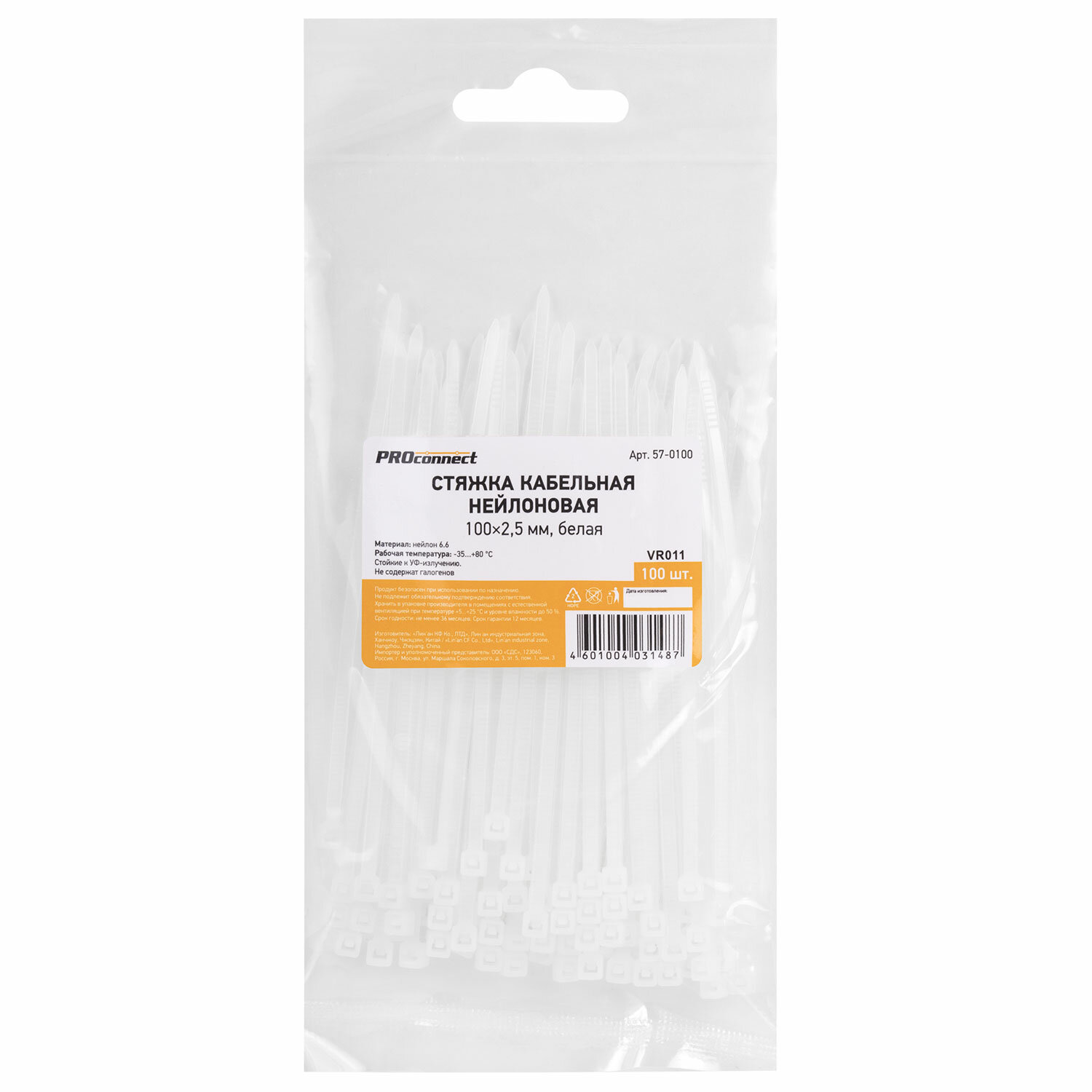 - Хомуты (стяжки), нейлоновые, 2,5 мм х 100 мм, комплект 100 шт., белые, европодвес, 57-0100