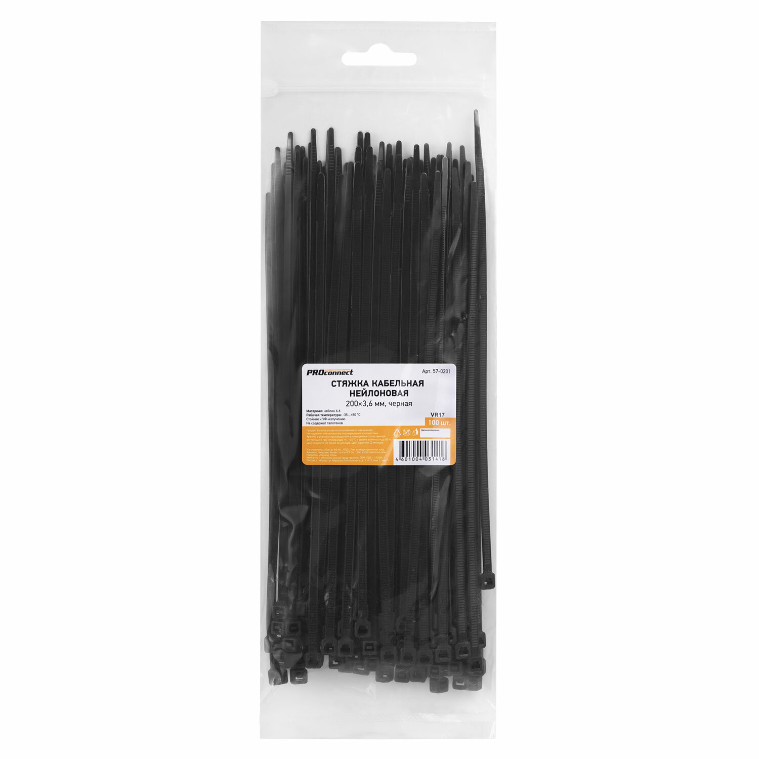 - Хомуты (стяжки) нейлоновые, 3,6 мм х 200 мм, комплект 100 шт., черные, европодвес, 57-0201