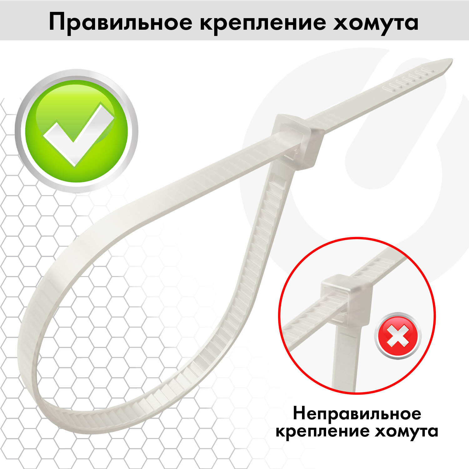 Стяжки (хомуты) представляют собой тонкую, эластичную полоску из нейлона высокой прочности (PA 6.6) с замком на конце. Благодаря применению качественного нейлона стяжки (хомуты) сочетают высокую прочность и пластичность, стойкость к перепадам температурного режима и уровня влажности воздуха.