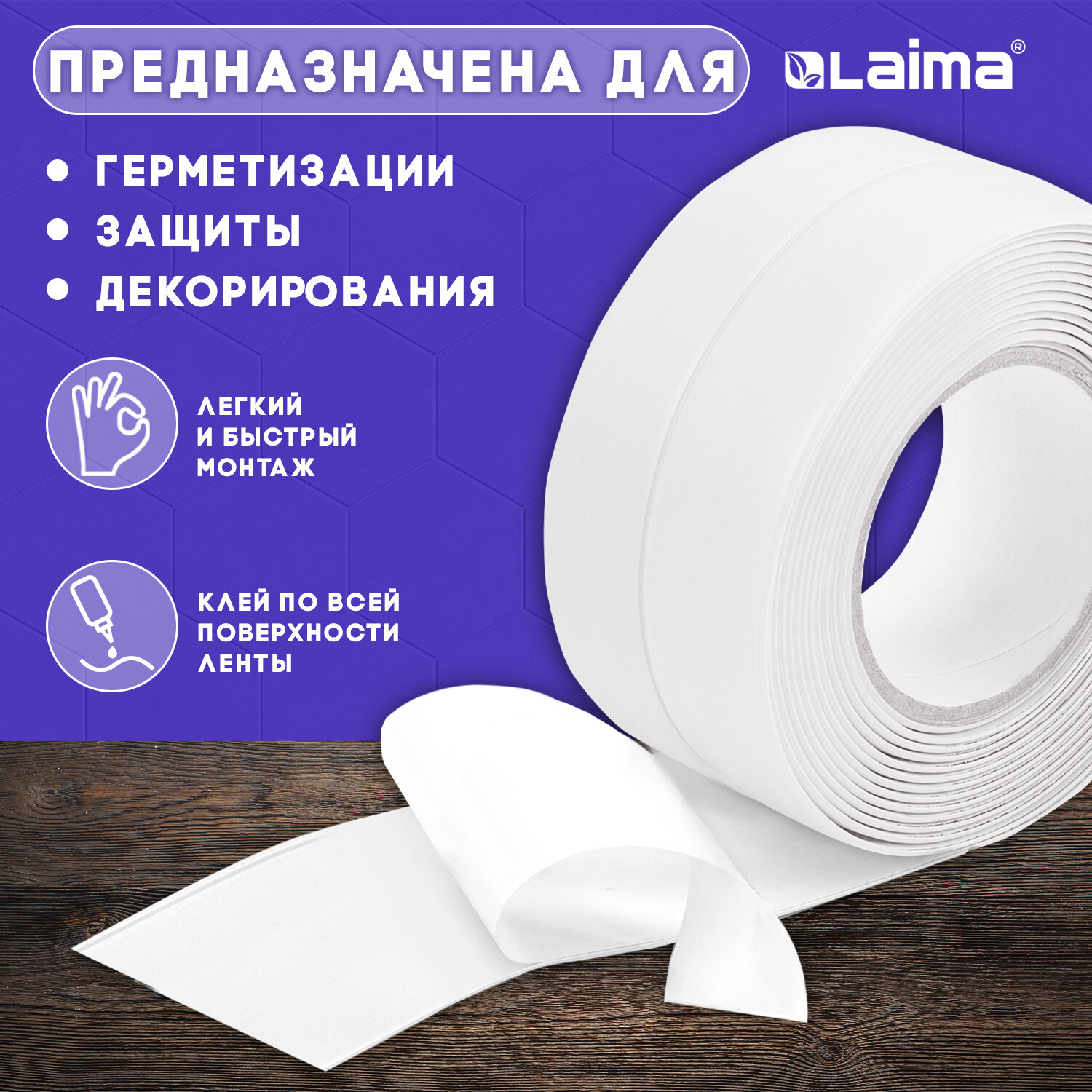 Широкие плинтусы для ванны незаменим при герметизации швов, превышающих 1,5 сантиметра. Как правило, такие швы невозможно оформить с помощью обычного герметика, поэтому применение ленты для оклейки ванной является единственным доступным способом надежной изоляции от протечек. Клейкая лента бордюрная для ванны и кухни 60 мм х 3,35 м, белая, акриловая основа, LAIMA, 608773
