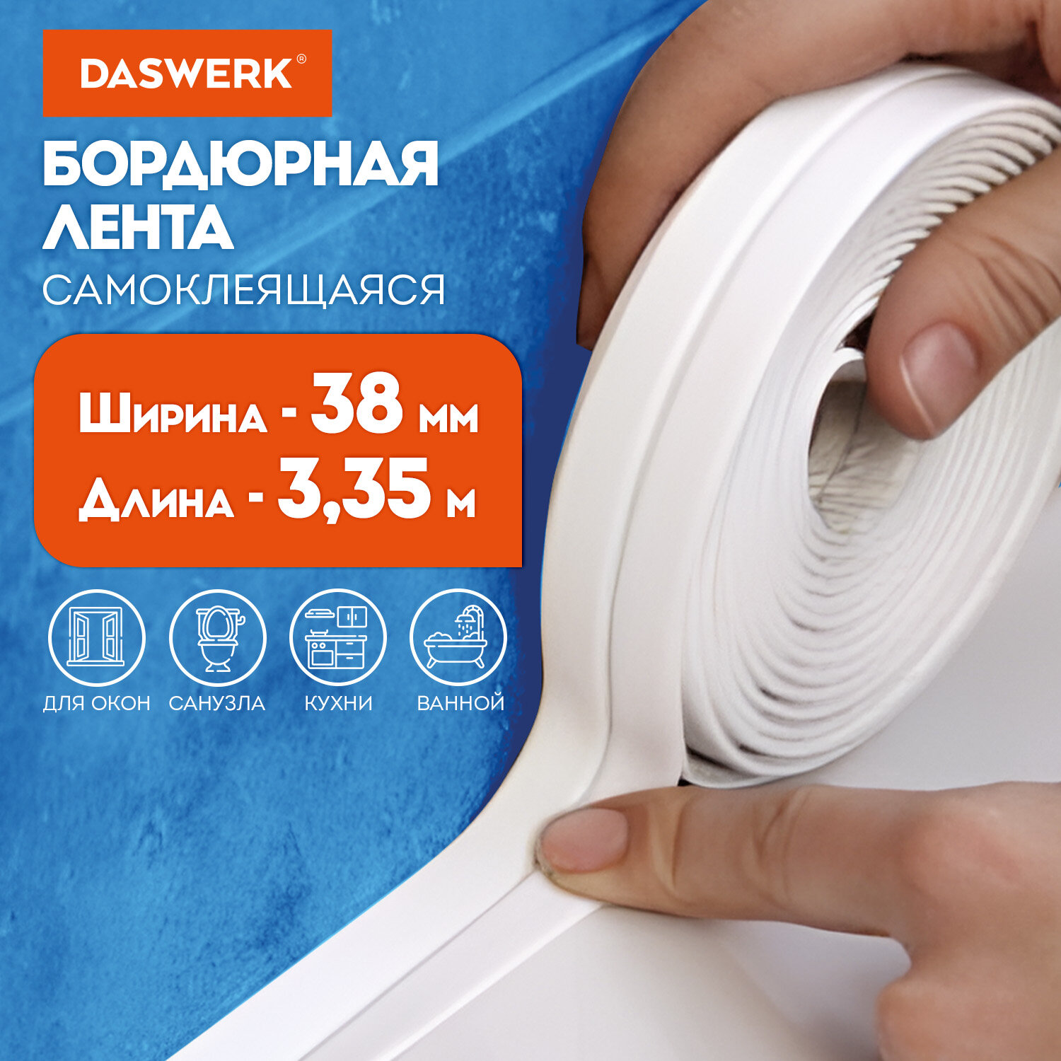 Широкие плинтусы для ванны незаменим при герметизации швов, превышающих 1,5 сантиметра. Как правило, такие швы невозможно оформить с помощью обычного герметика, поэтому применение ленты для оклейки ванной является единственным доступным способом надежной изоляции от протечек. Клейкая лента бордюрная для ванны и кухни повышенной клейкости 38 мм х 3,35 м, бутил, DASWERK, 608774