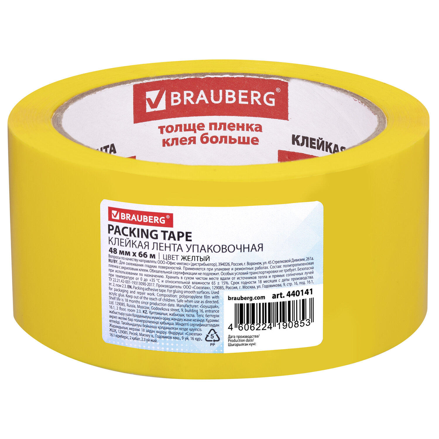 Толщина скотча 45 мкм позволяет переносить воздействие низких температур и влажности и выдерживать вес коробки 15-17 кг. Клейкой ленты шириной 48 мм и длиной намотки 66 м хватит на продолжительное время. Цвет - желтый. Клейкая лента упаковочная, 48 мм х 66 м, ЖЕЛТАЯ, толщина 45 микрон, BRAUBERG, 440141