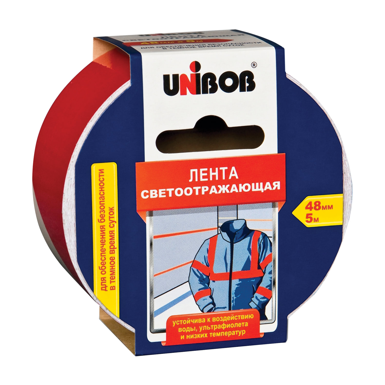 - Клейкая лента СВЕТООТРАЖАЮЩАЯ 48 мм х 5 м, КРАСНО-БЕЛАЯ, износоустойчивая, европодвес, UNIBOB, 48984