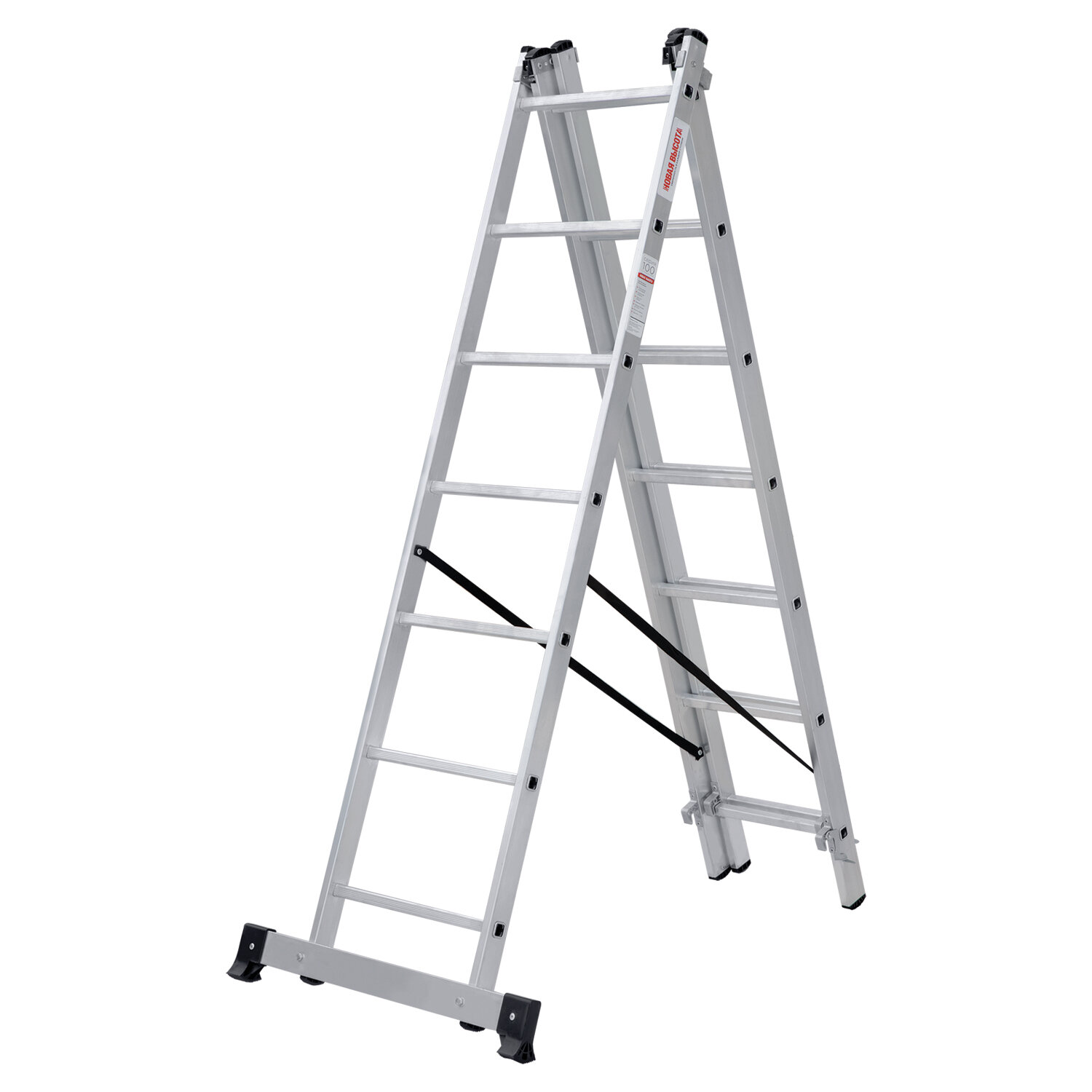 Широкая поперечная траверса обеспечивает высокую устойчивость, а надёжно закреплённые на стойках и траверсе пластиковые наконечники препятствуют скольжению. Верхняя секция легко вынимается и устанавливается и может служить отдельной приставной лестницей. Лестница-трансформер 3-х секционная 3х7 ступеней, высота 4,5 м (3 секции по 1,9 м), нагрузка 150 кг, алюминий, НОВАЯ ВЫСОТА, 1230307