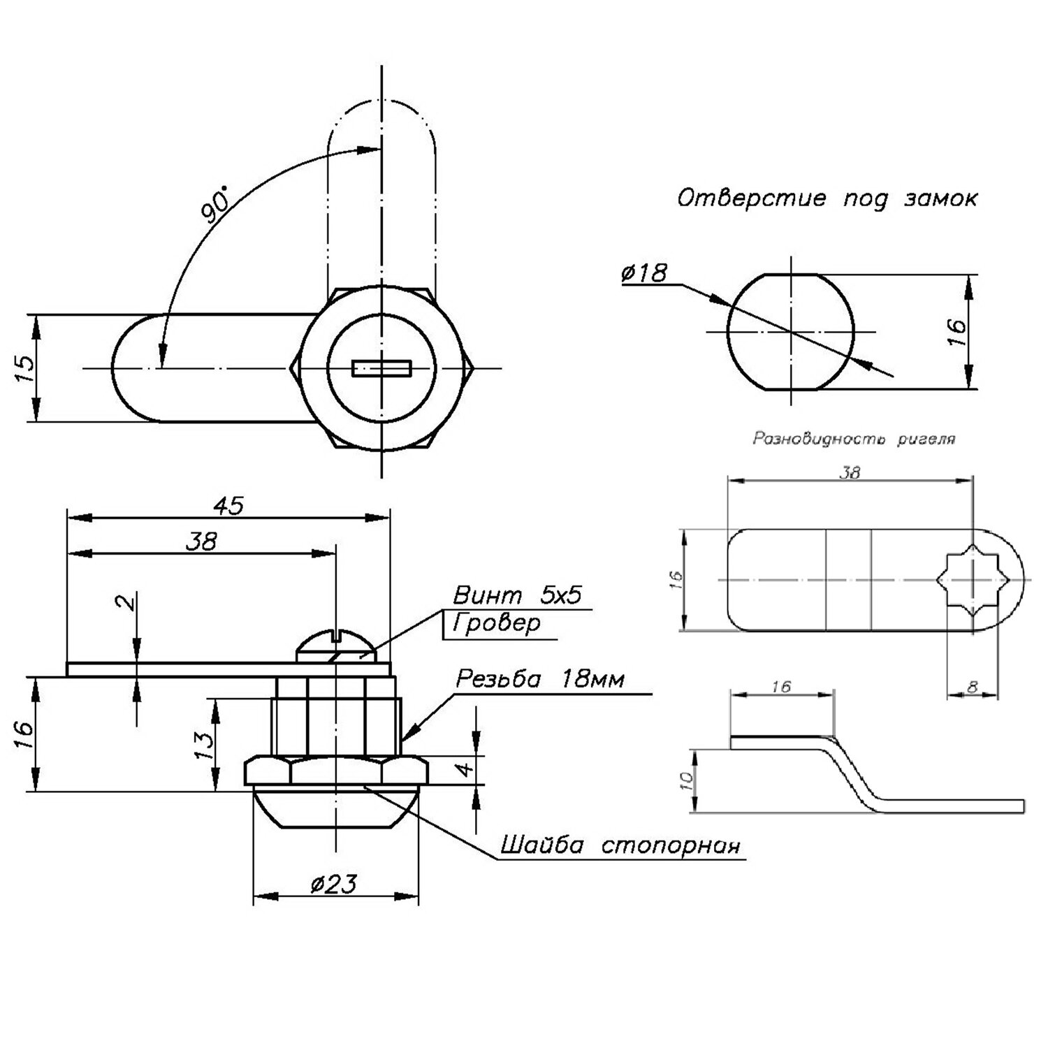 - Замок почтовый Banggu, длина 16 мм, d - 17,5 мм, 90 градусов, прямой ригель, гайка, 3497